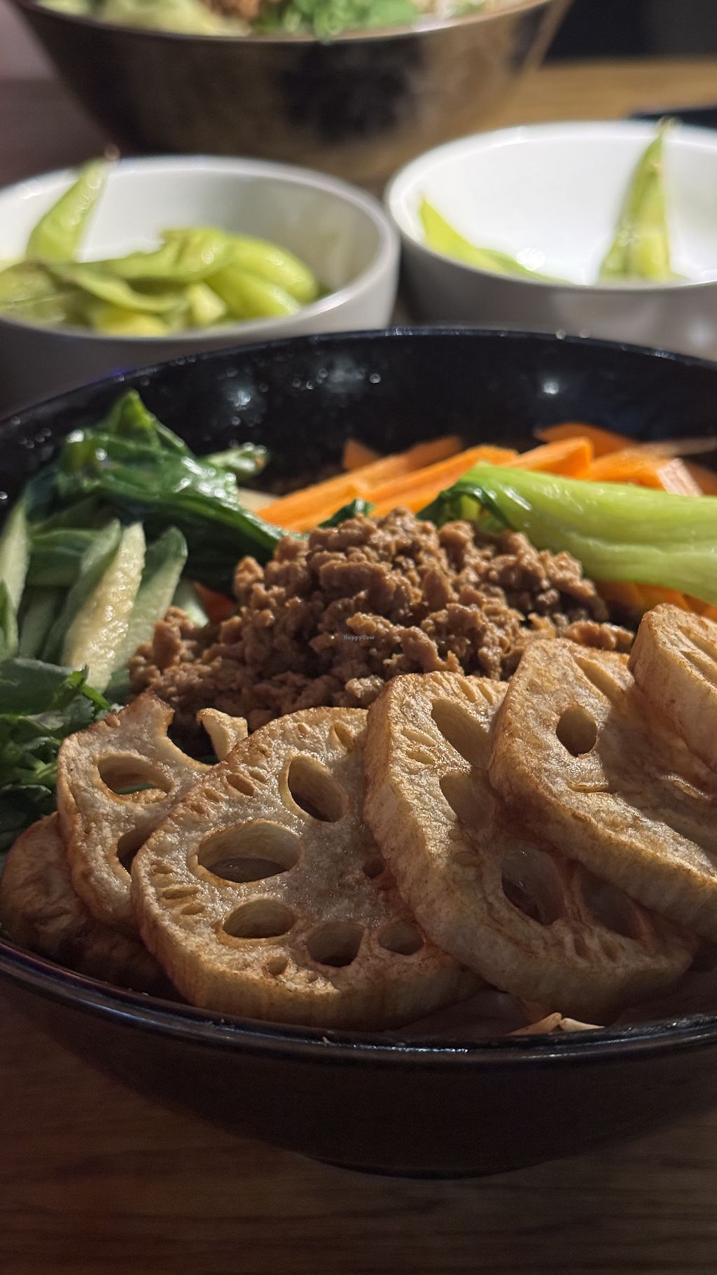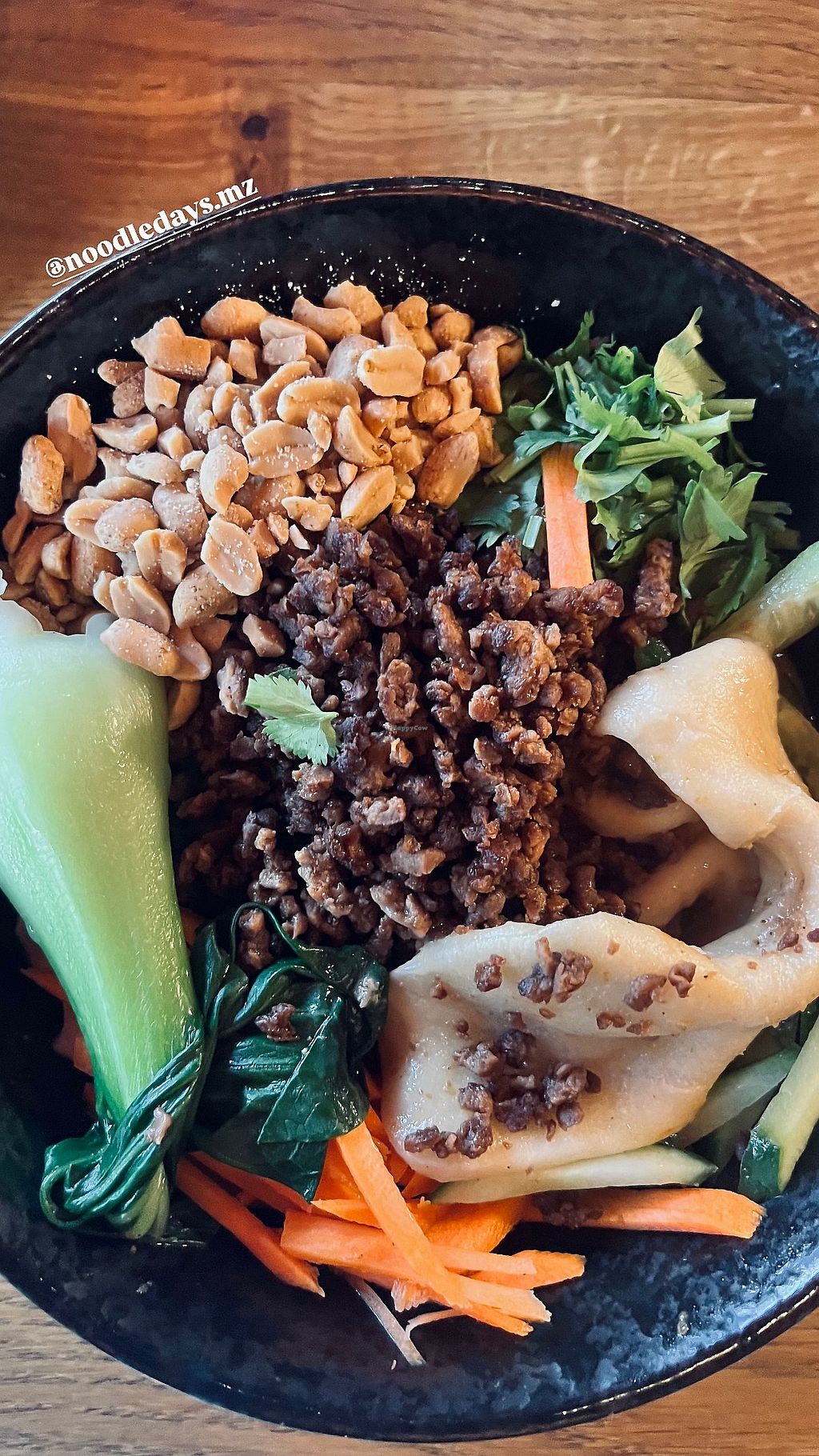 Serves meat, vegan options available. Hand-pulled noodles and dumplings with labeled vegan options, including tofu biang, Asian Bolognese biang, tofu cut noodles, and dessert. Open Mon-Sat 11:30-23:00. Closed Sun.