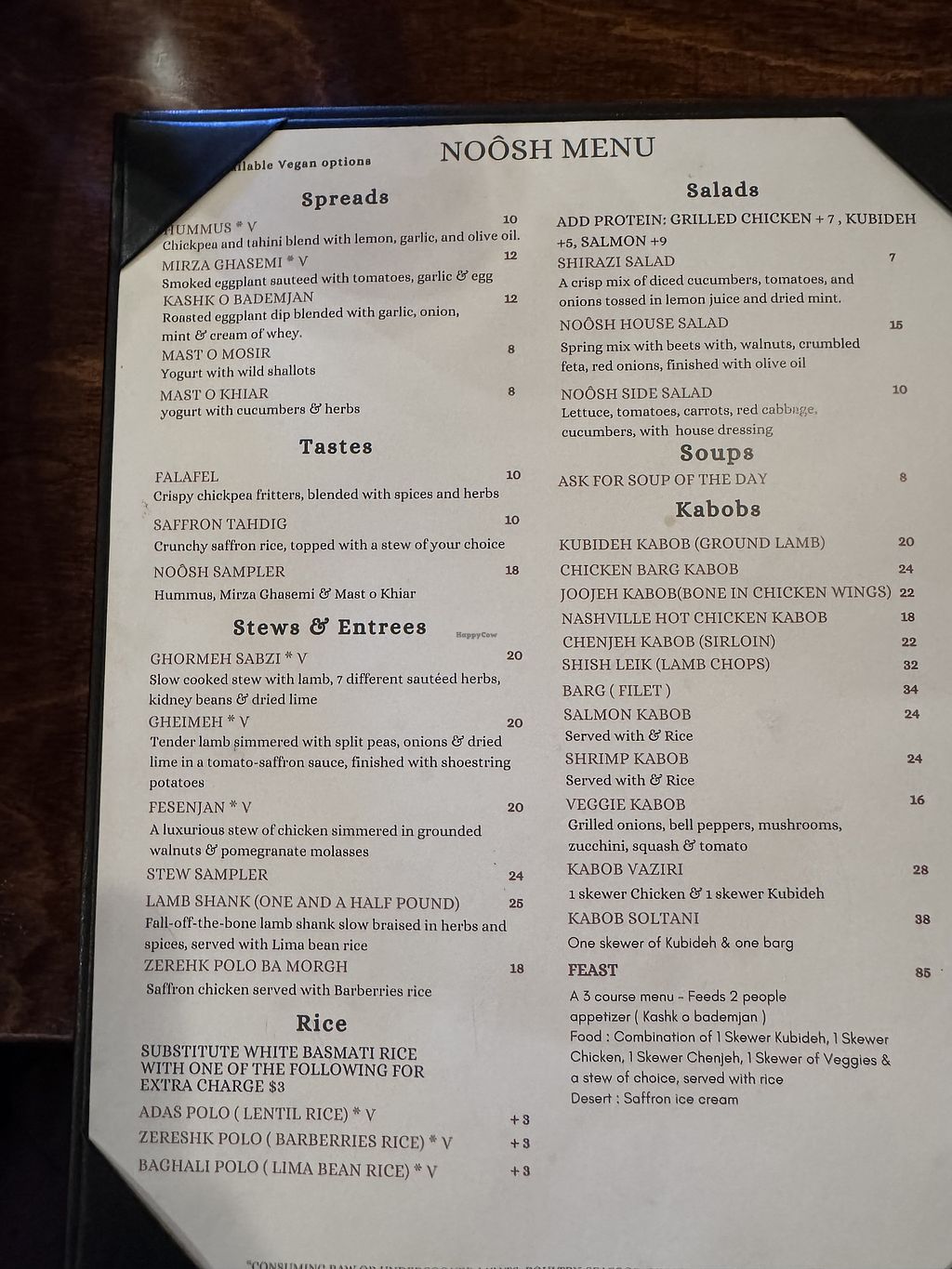 Serves meat, vegan options available. Persian restaurant offering vegan dishes like ghormeh sabzi (herb stew with beans), fesenjan (walnut and pomegranate stew), and hummus. Open Tue 4:00pm-9:00pm, Wed-Sat 11:00am-9:00pm, Sun 11:00am-8:00pm. Closed Mon.