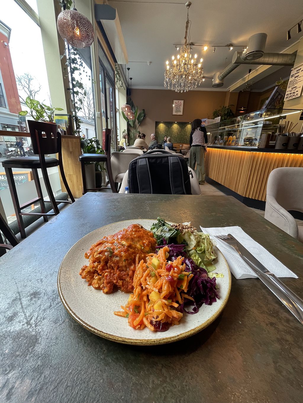 This is a very conveniently located restaurant, near the old city square. Just a couple of blocks from The Grand Hotel. There is a menu on the wall over the hot bar, but most of the food is served cafeteria style, out of warming trays. I got the lasagna, which came with a mixed green and vegetable salad. I also got the crispy sushi roll. The lasagna and the sushi were very good. I also got a couple of jalapeño poppers. They were good, but if there was any spice to them, I didn’t notice (welcome to Scandinavia). I got a big slab of carrot cake. The cake portion of the carrot cake was excellent. The icing, sadly, was the typical bland and largely flavorless white icing that vegan places often put on carrot cake. Note to everyone: Carrot cake is frosted with CREAM CHEESE icing. The cake was 9/10. The icing was 4/10. I digress.😄