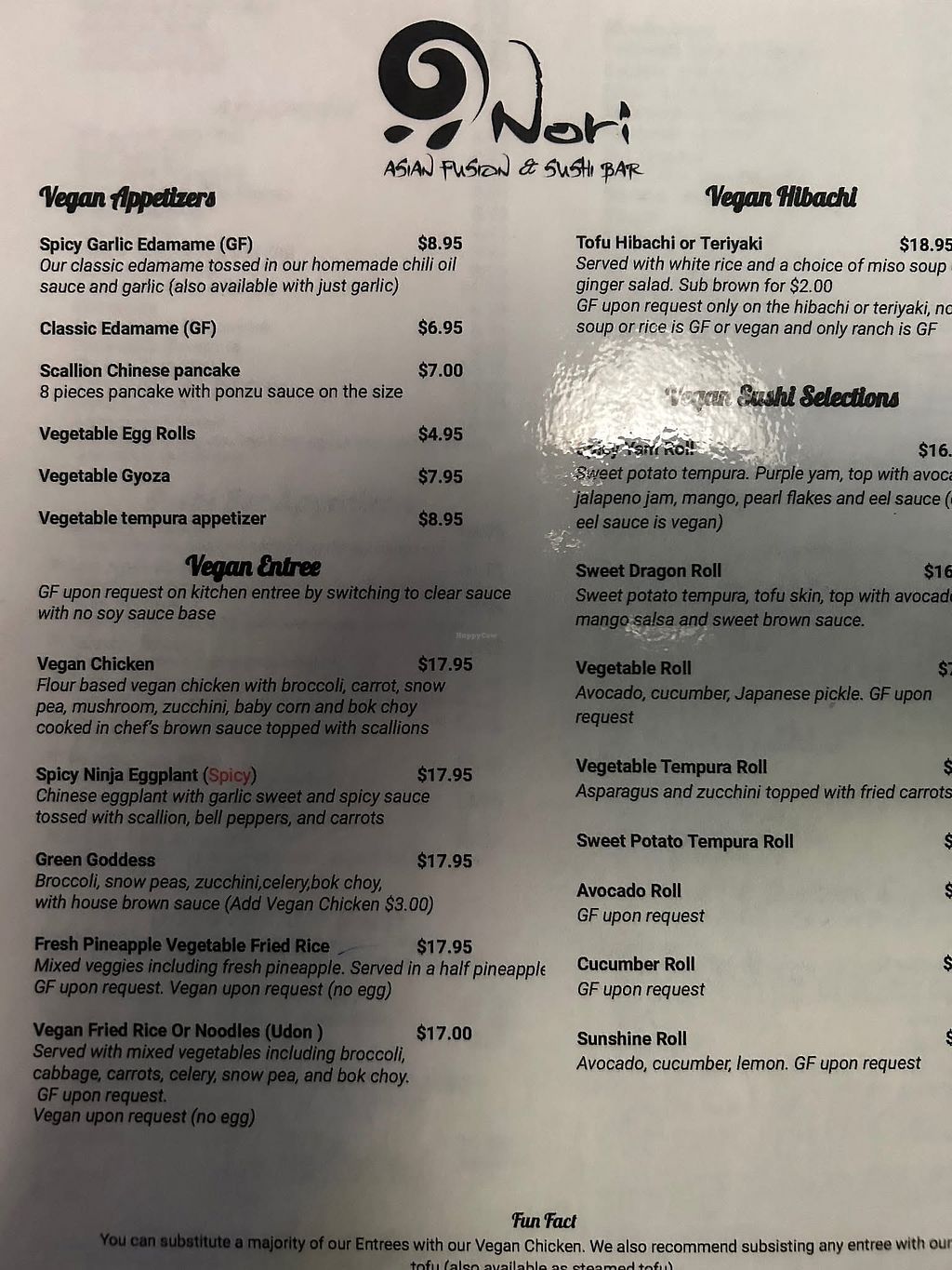 Serves meat, vegan options available. Asian fusion restaurant with separate vegan menu available upon request. Offers vegetable stir fry, sushi rolls, noodles and more. Open Mon-Thu 11:00am-10:00pm, Fri-Sat 11:00am-11:00pm, Sun 11:00am-10:00pm.