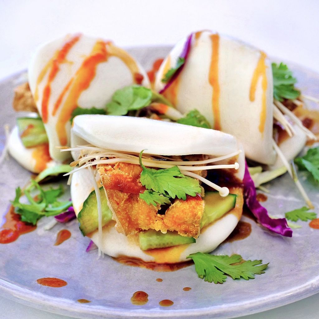 🌱 Bao buns - ($21 for 3) with crispy tofu, enoki mushrooms, sticky Asian dressing, sriracha, and the coleslaw was piled up in the center of the plate so you can add as much as you wish. Absolutely loved the sauce in this, as well as the crispy tofu.