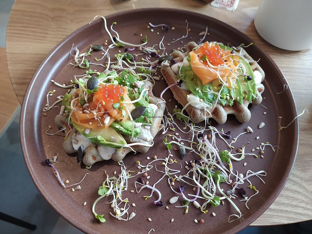 Herzhafte Waffeln mit Avocado und veganem Lachs