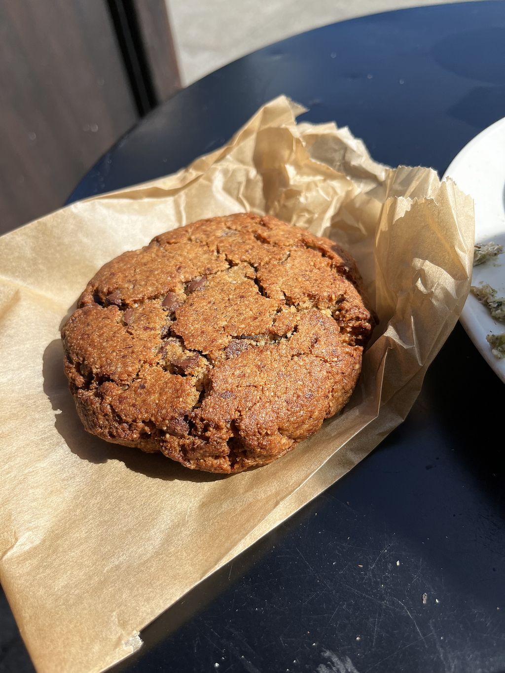 My partner and I split a chocolate chip cookie while we waited for our meals. It was expensive, but big enough to share. I ordered the Nourish Savory Brekkie Bowl without avocado, and I added tofu. The red pepper almond dressing was tasty. The meal was filling after a nine-mile hike from Lands End.