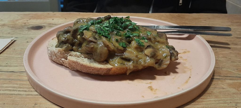 Serves meat, vegan options available. Small cafe with good choice of vegetarian/vegan food. Plant-based milk available. Locally sourced ingredients. Outside covered seating as well. Has special events., Creamed mushrooms on sourdough toast