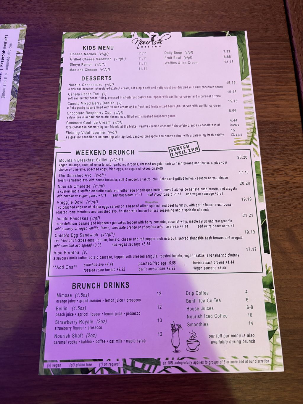 A vibey place with delicious, fresh food. We got the cucumber salad with avocado and a nourishing bowl, with a pistachio croissant for dessert. The quality of the food and the flavour is perfect. It was exactly what I wanted in this meal. Only downside is the price. $3.33 for half an avocado seems steep to me. And $17 for a poutine also seems like a lot. Our meal costed $53.42 pre-tip. But I guess that’s on par for Banff restaurants?