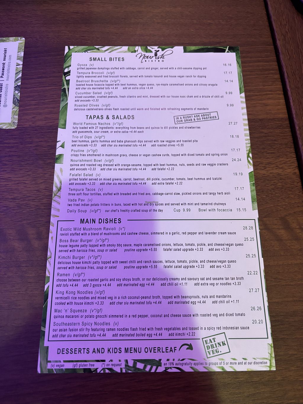 We had a delicious brunch at Nourish Bistro! It is vegetarian so if you’re dining with non-vegans, they can get their eggs and cheese. I had a chickpea omelette with vegan cheese, mushrooms, and vegan sausage with a side salad. It was superb. Highly recommended.