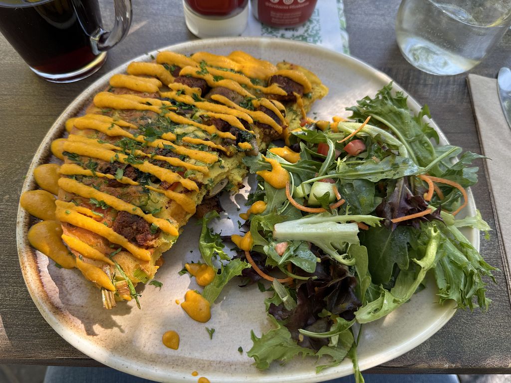 Chickpea Omelette with vegan sausage, vegan cheese, and mushrooms with…