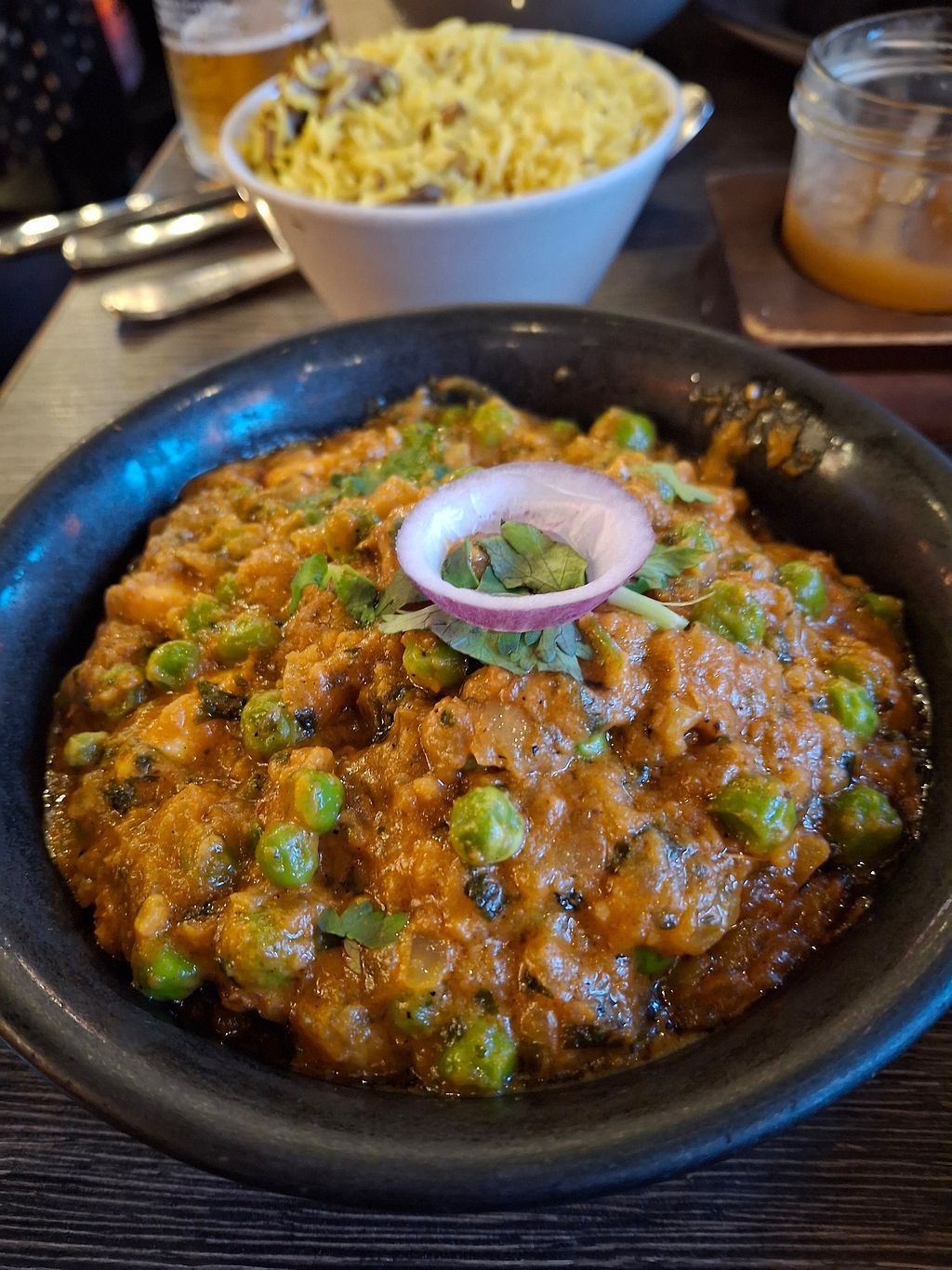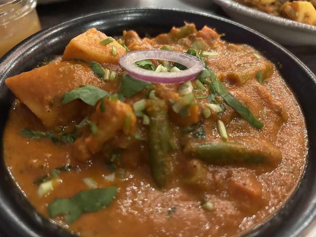 An absolutely tremendous and efficient place with a separate vegan section and where most dishes can be adapted as vegan. Staff are knowledgable and relay orders to the kitchen via headsets and tablets. Our tarka dhal and vegetable madras mains were so good. The Madras had a delightful heat to it as did the Bombay potatoes but to a lesser extent. Make sure you book online to avoid disappointment, this is a great place to experience.