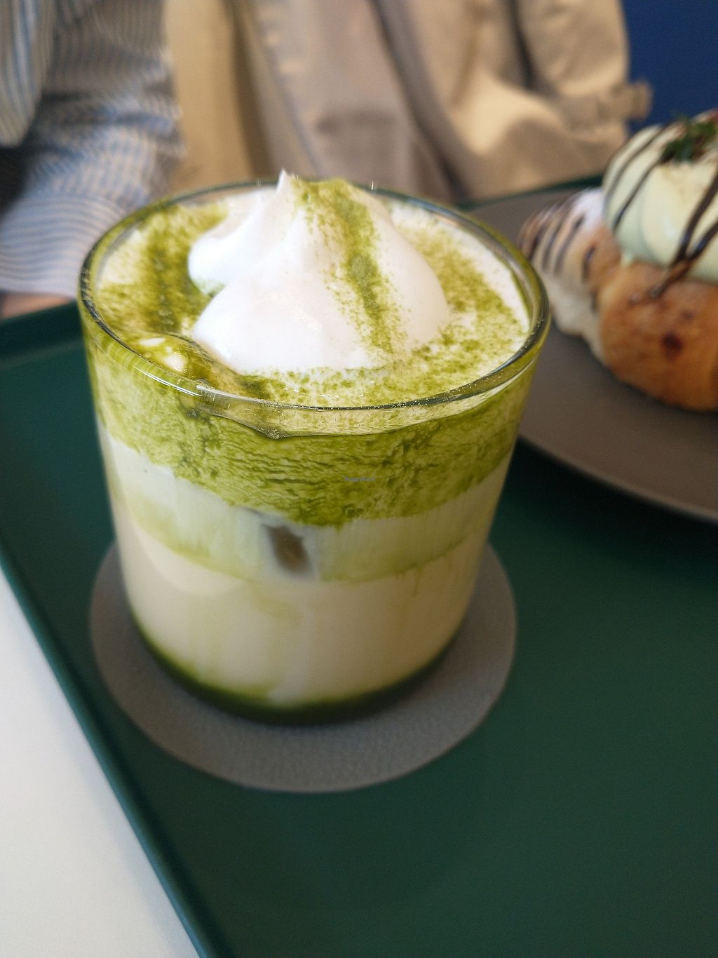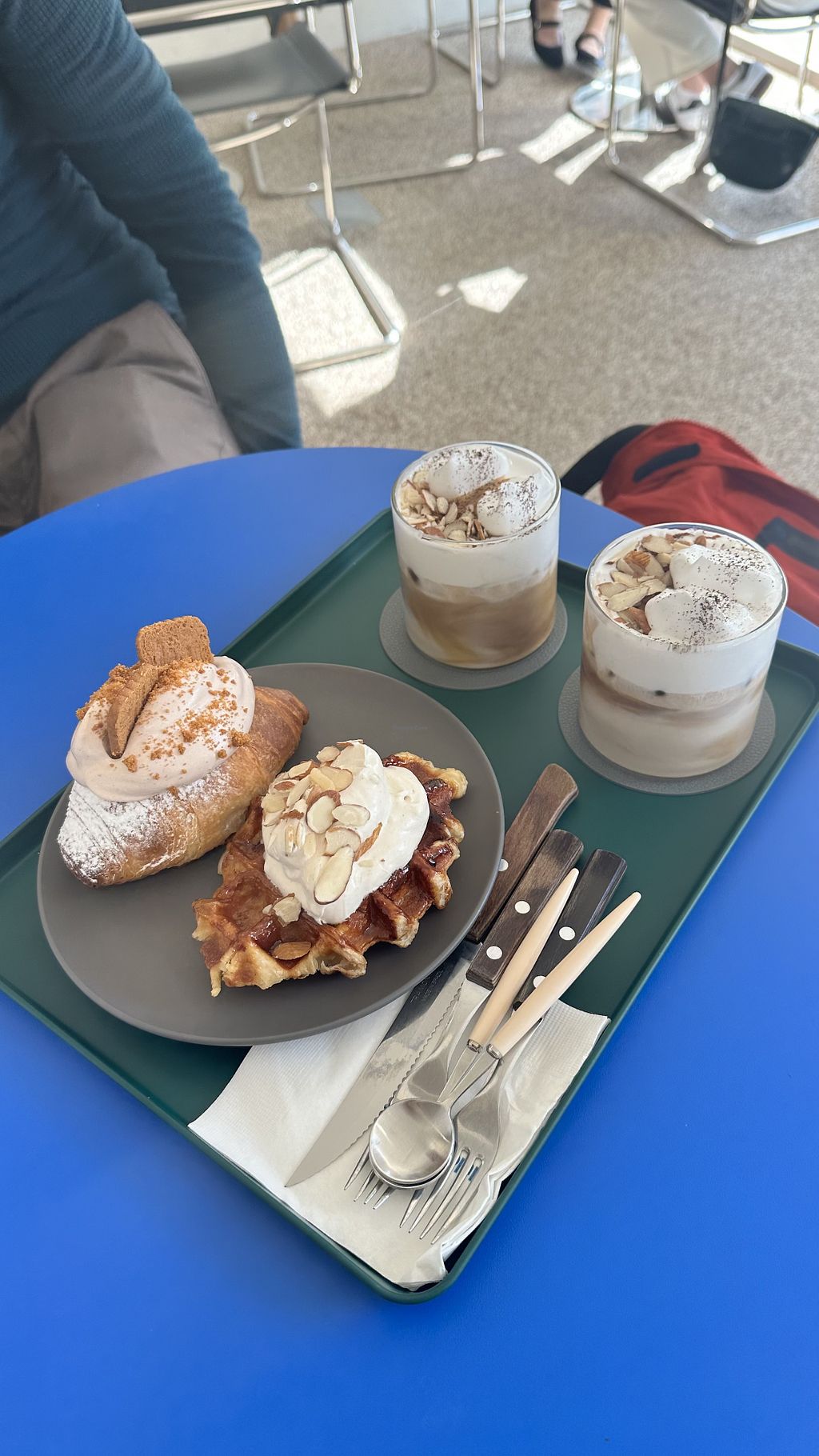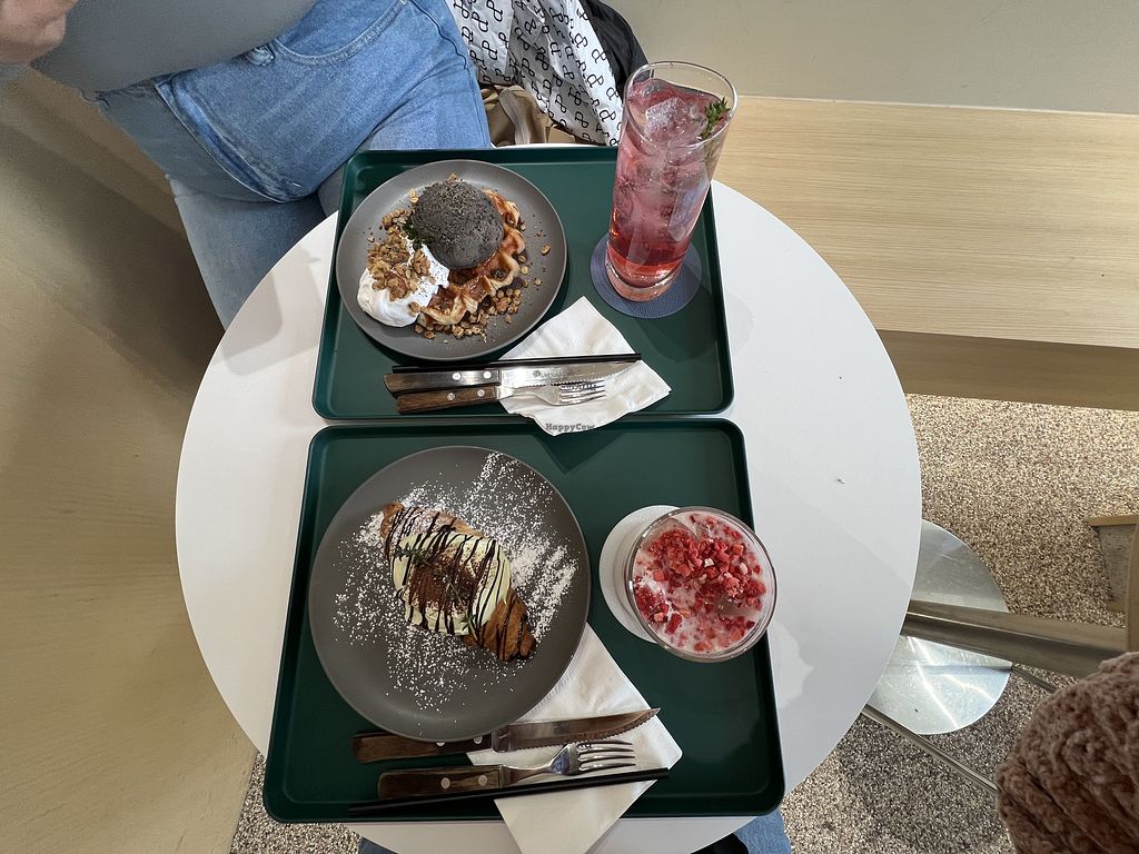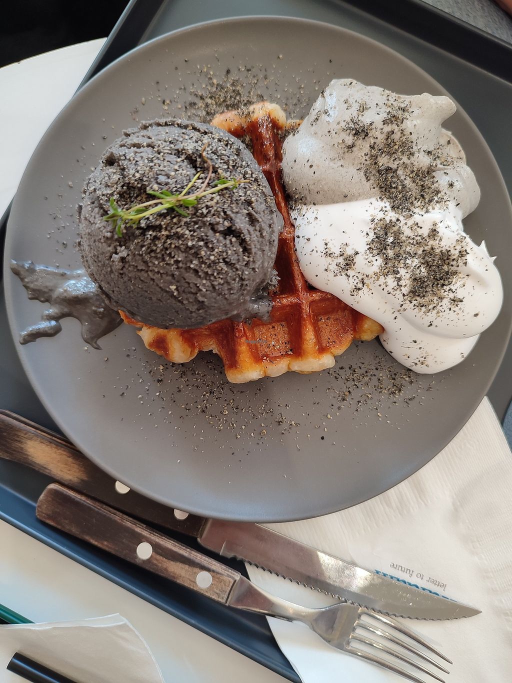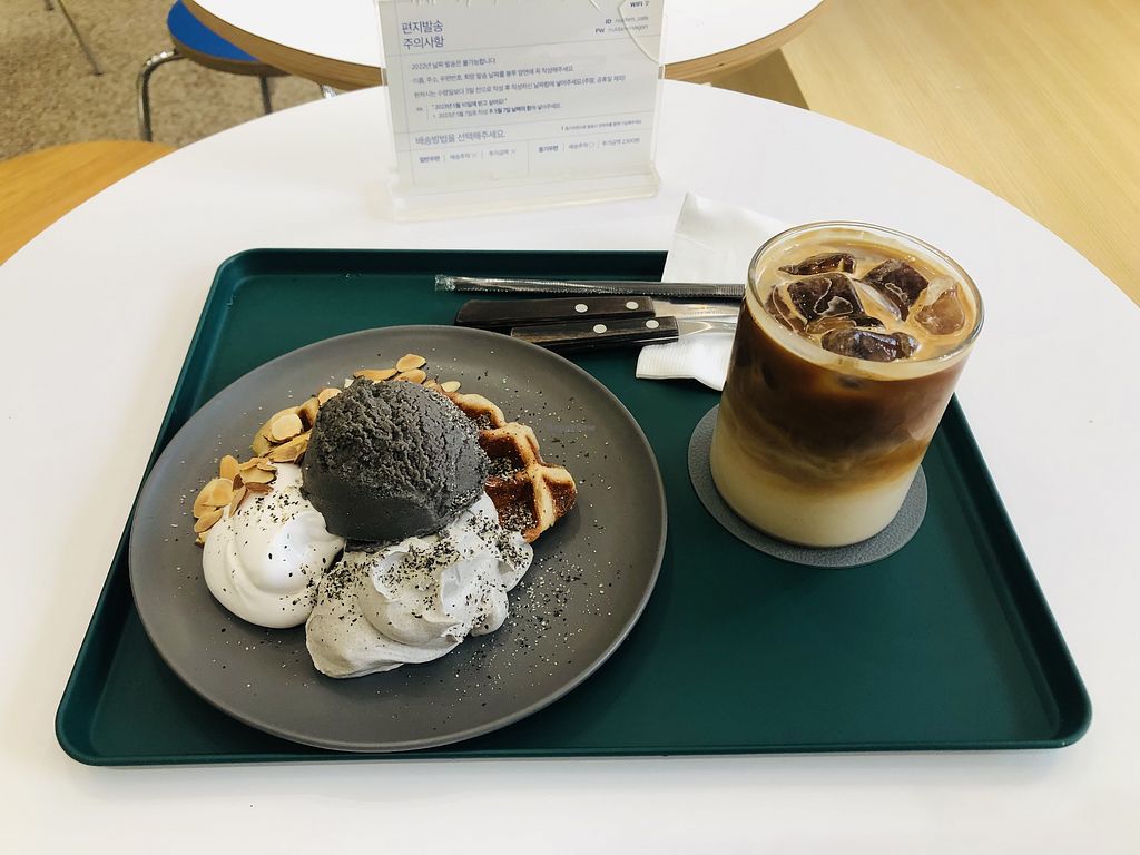 Waffle with Black Sesame Ice Cream, Whipped Cream & Iced Vanilla Latte…