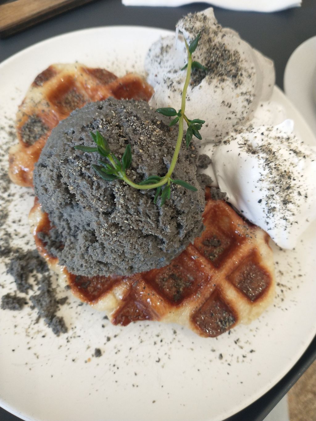 Croffle with black sesame ice cream and black sesame and other cream
