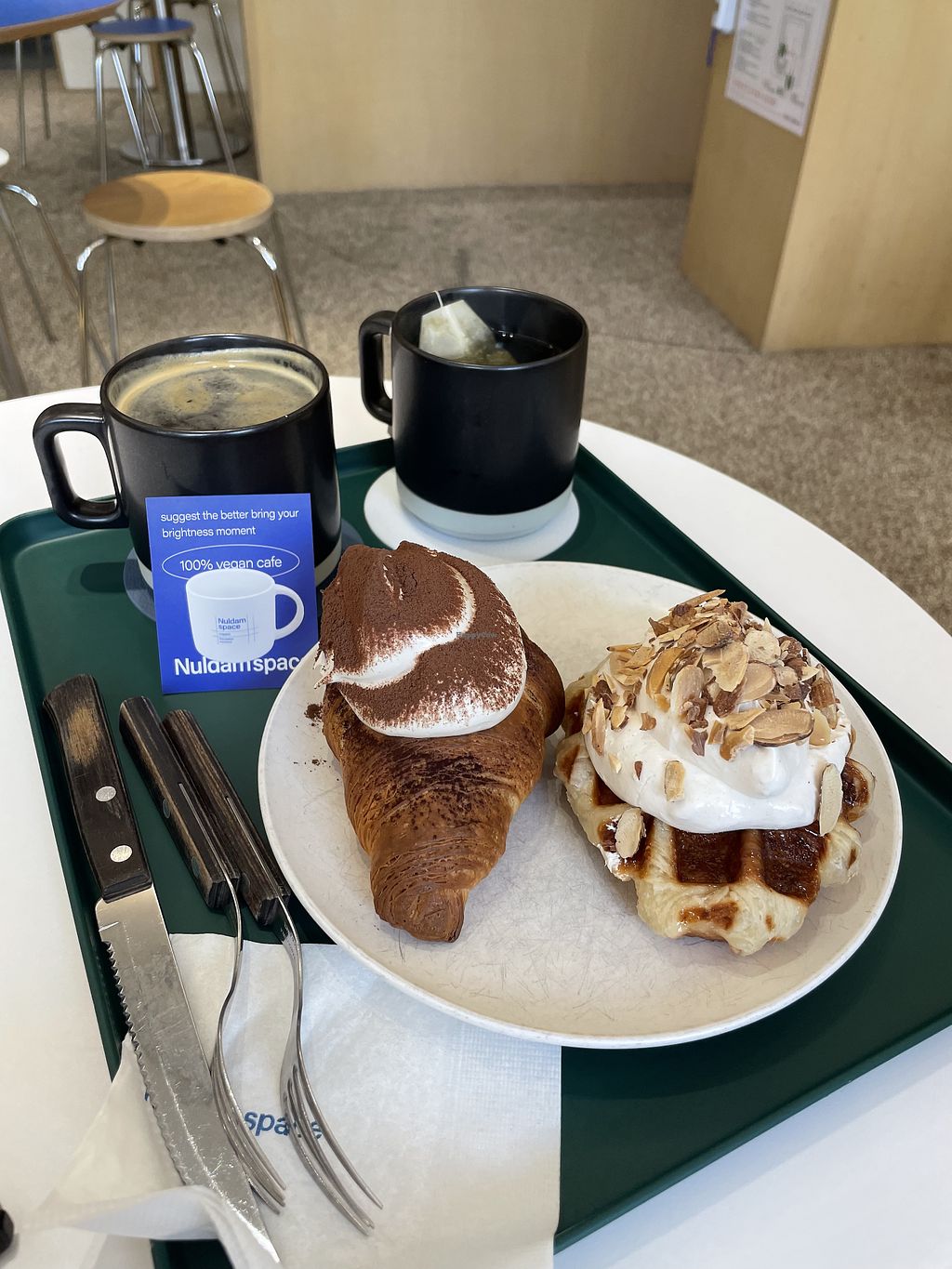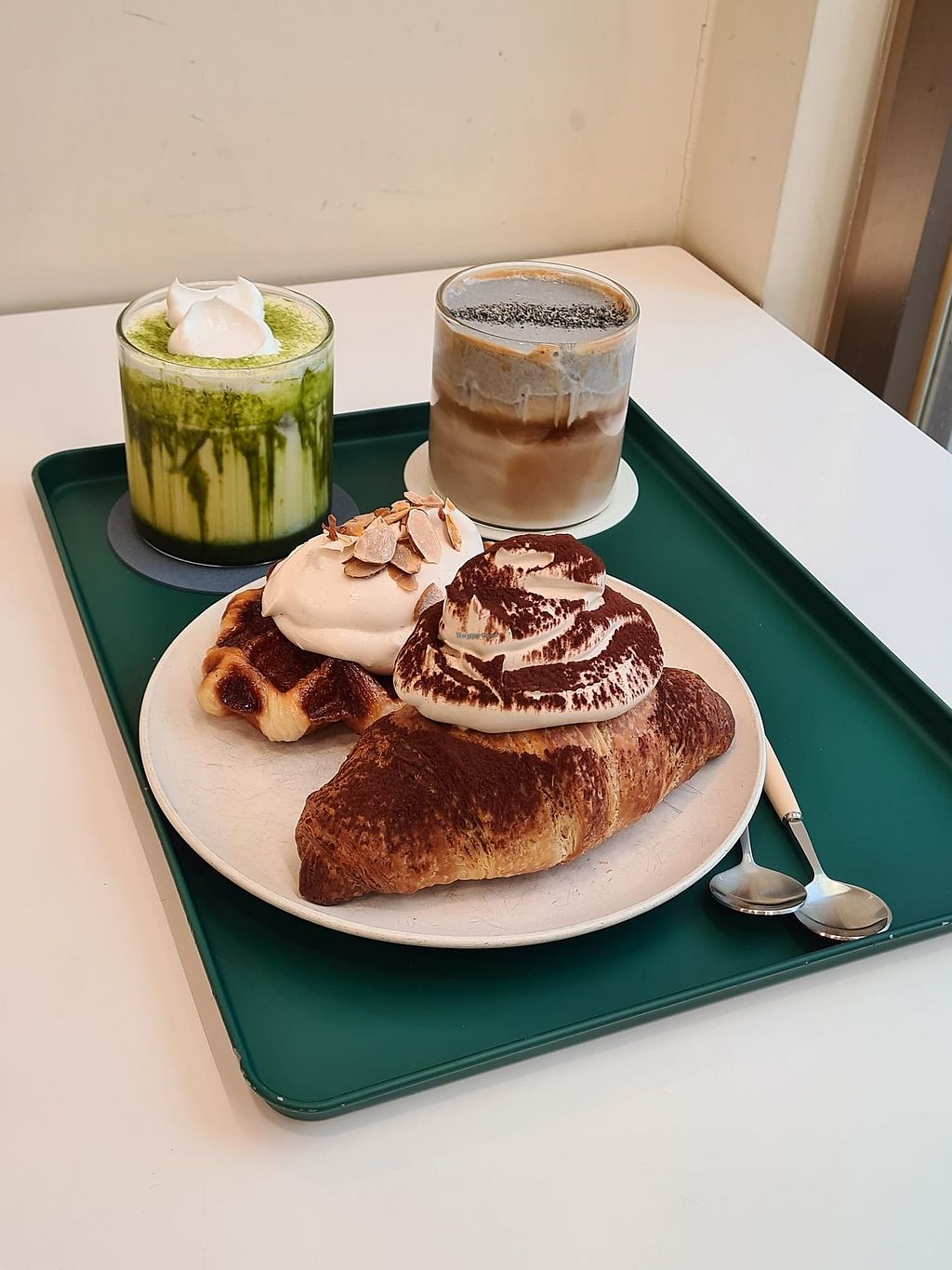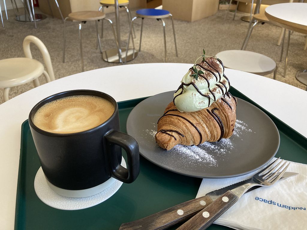 Matcha cream croissant, black sesame iced coffee