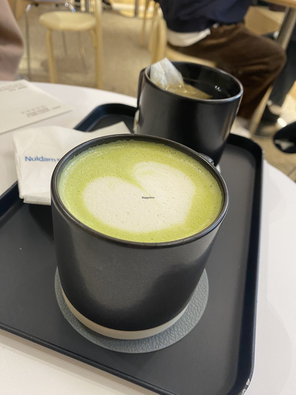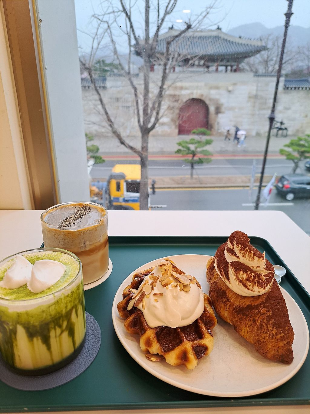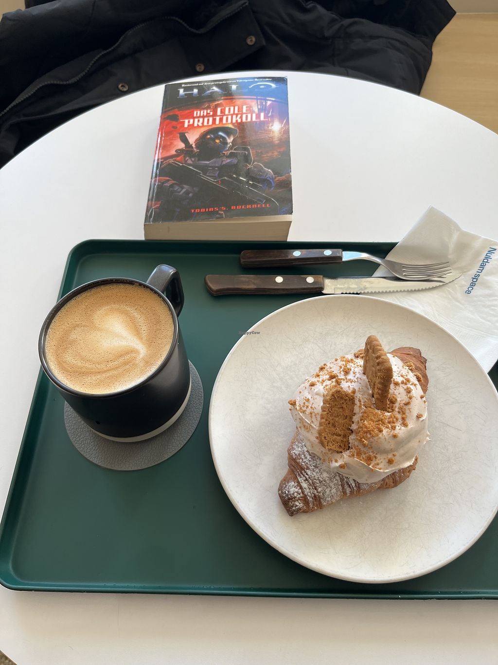 Matcha cream croissant, black sesame iced coffee