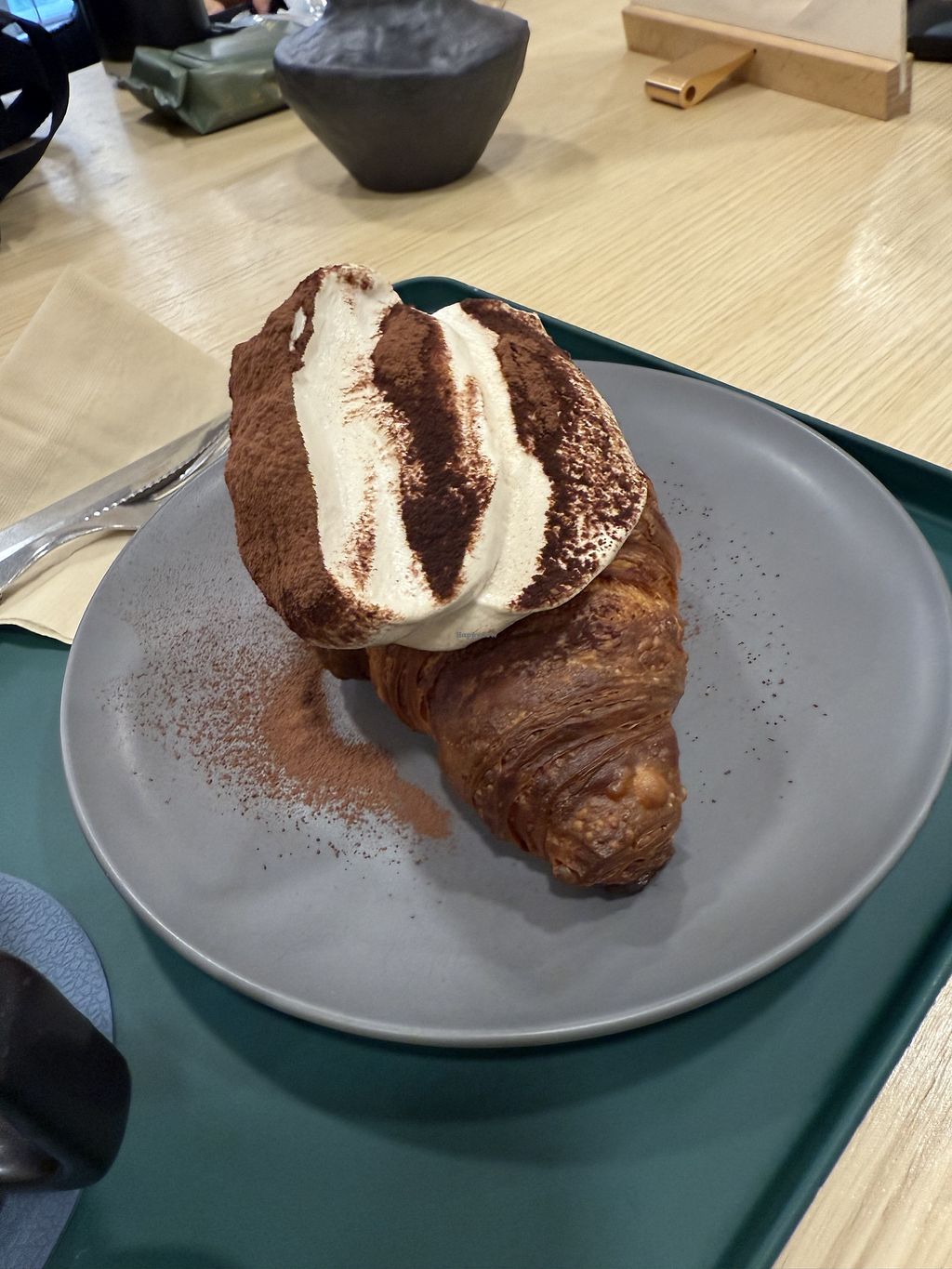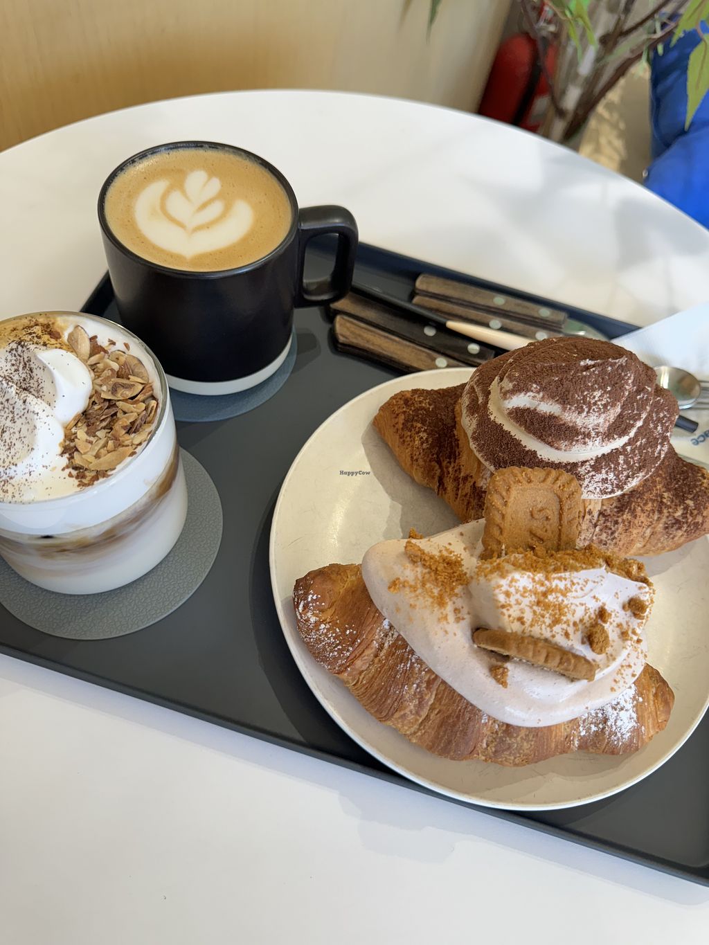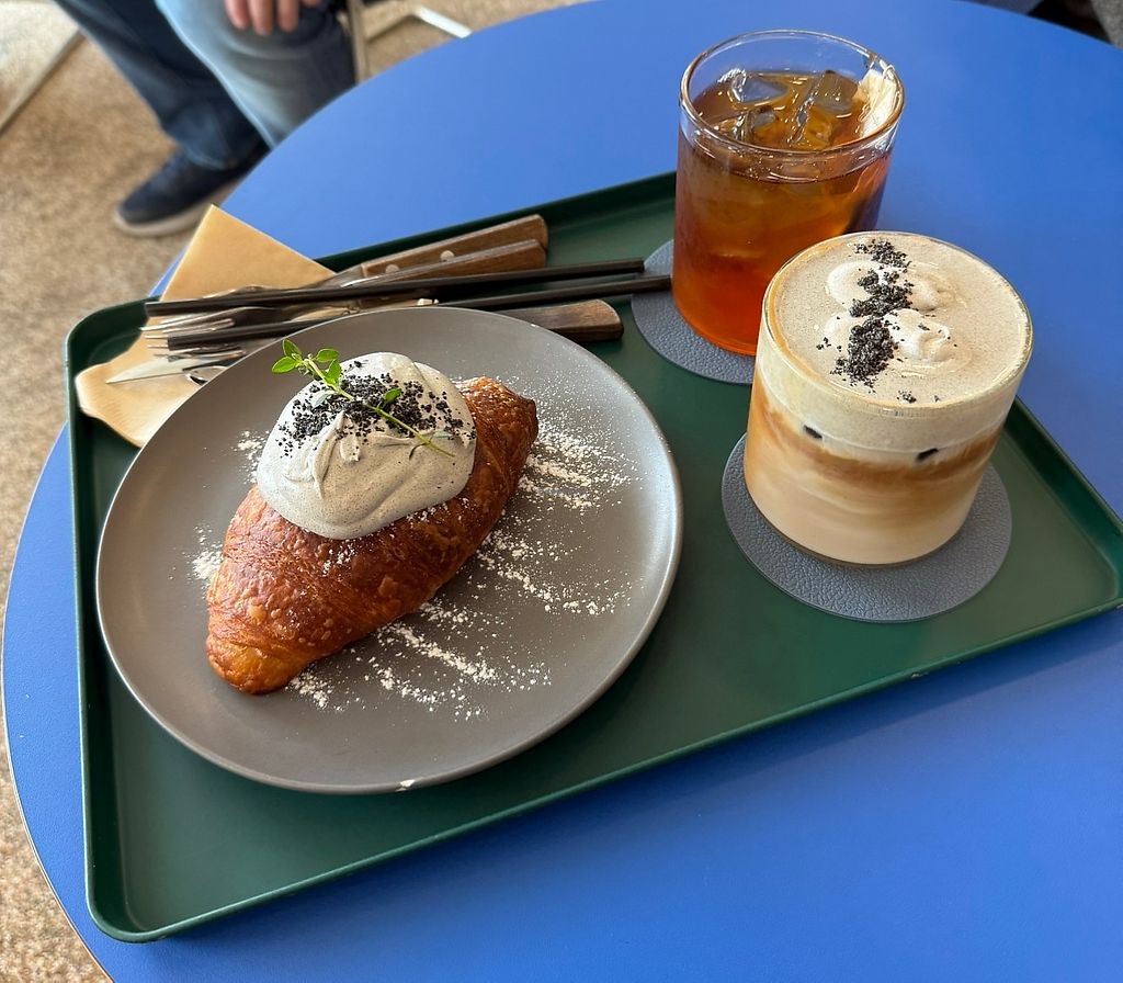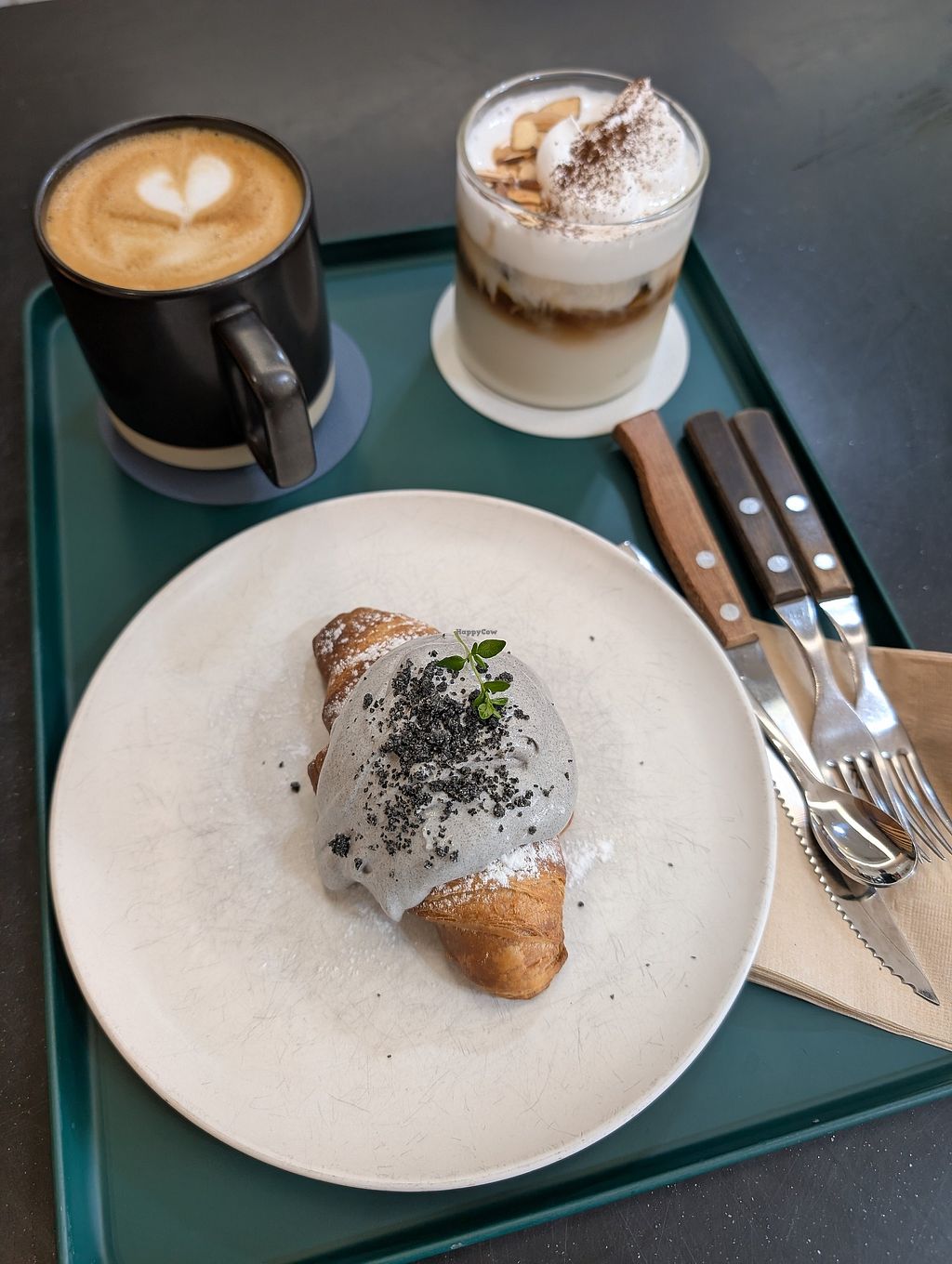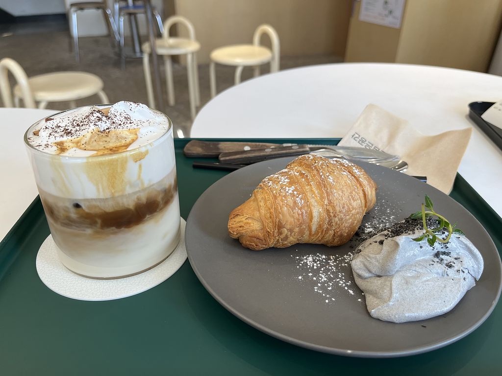 (clockwise from top left) Hot latte; matcha croissant, specialty almon…