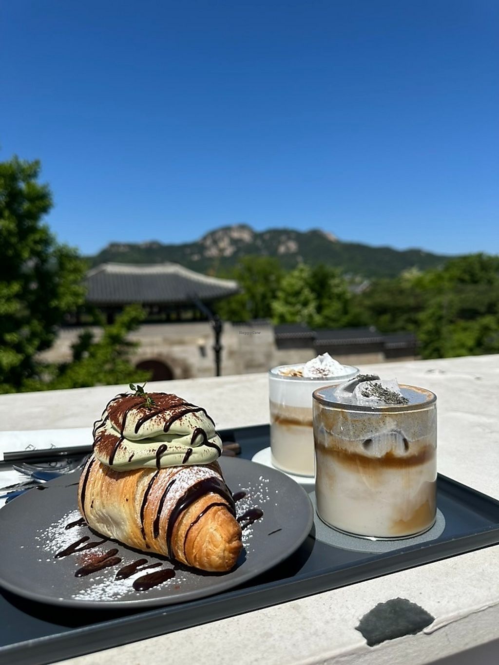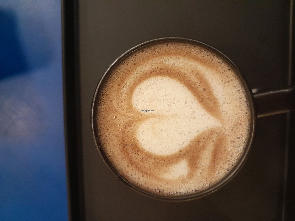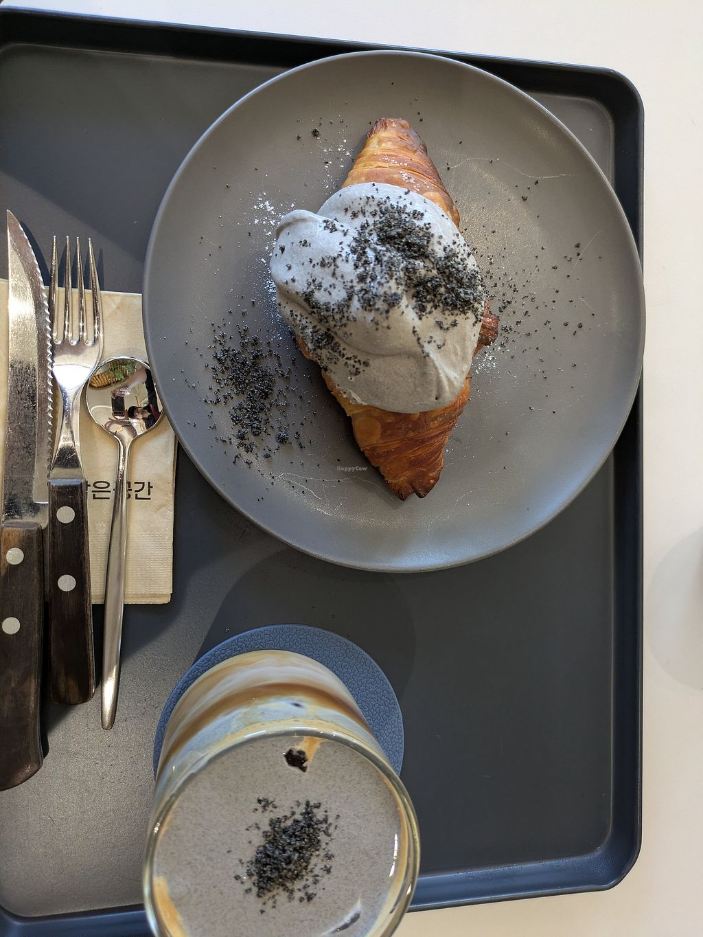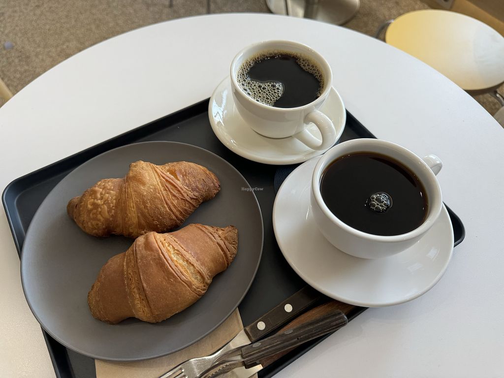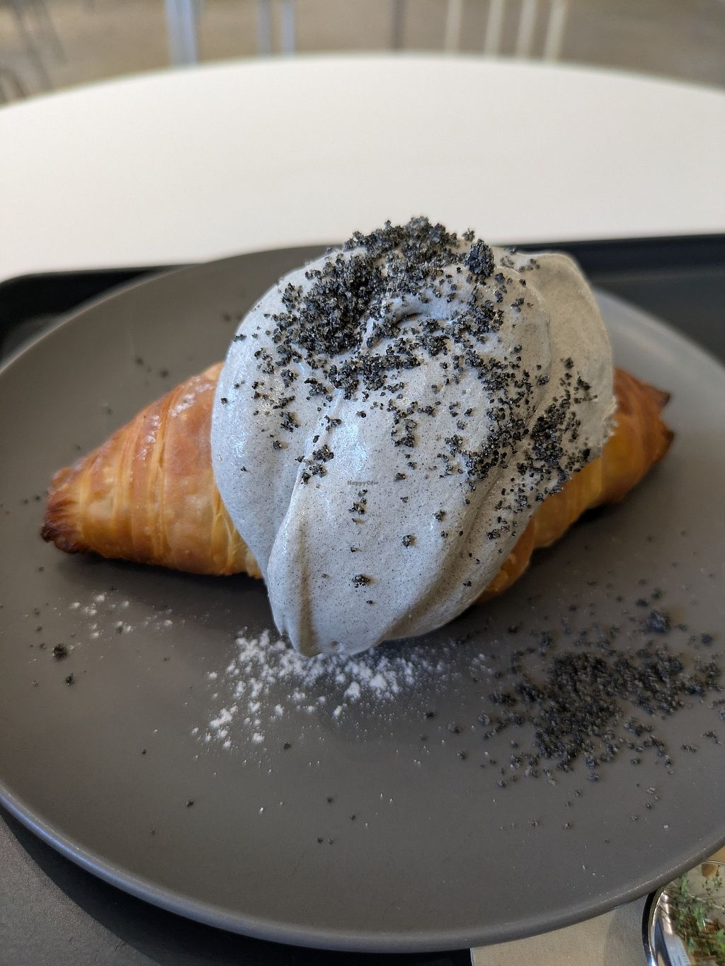 (clockwise from top left) Hot latte; matcha croissant, specialty almon…