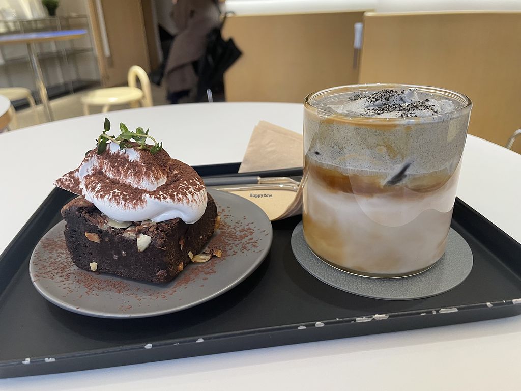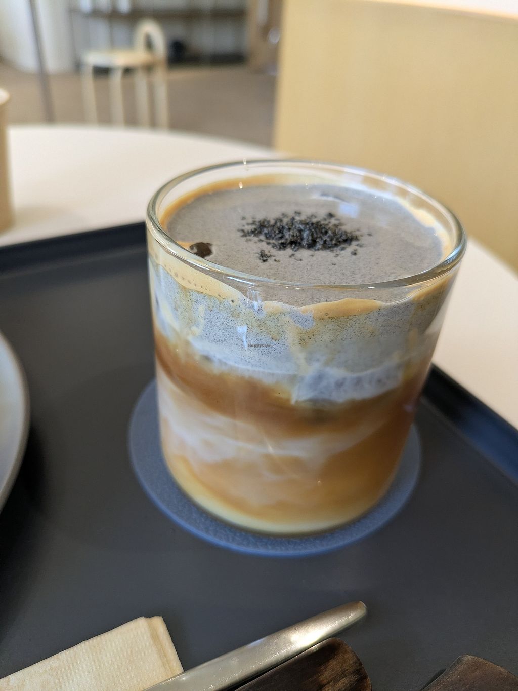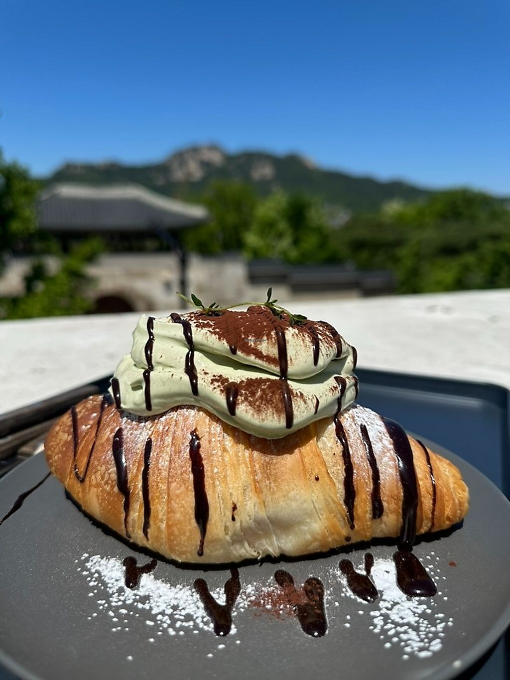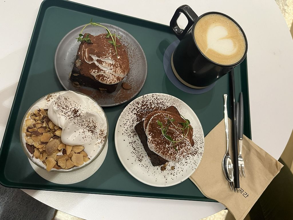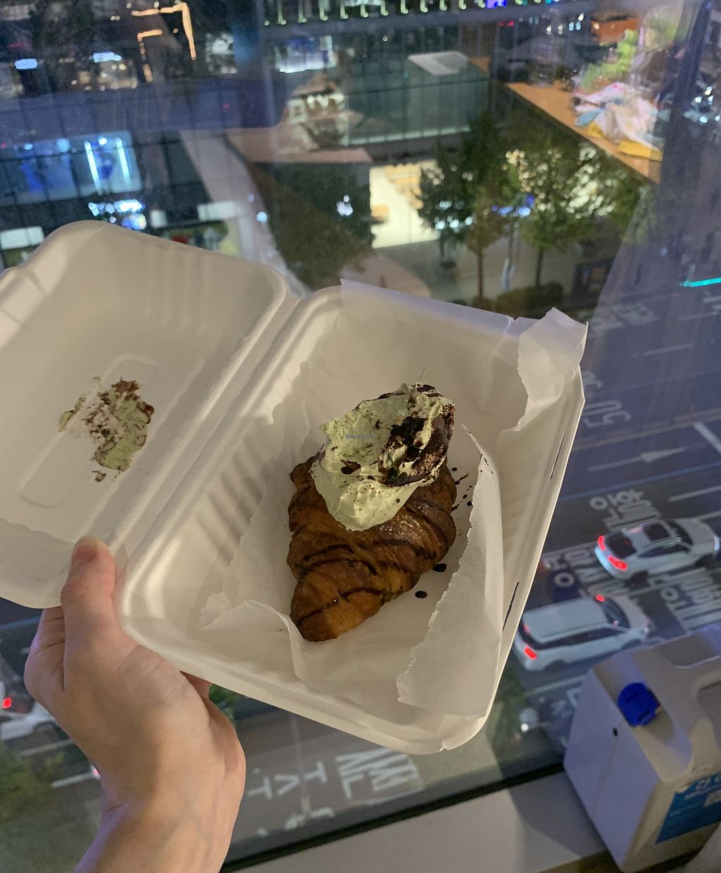 (clockwise from top left) Hot latte; matcha croissant, specialty almon…