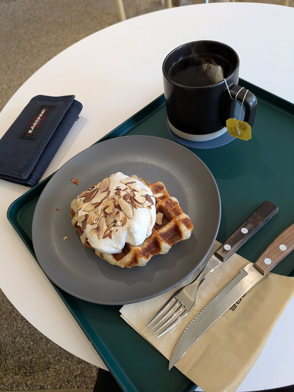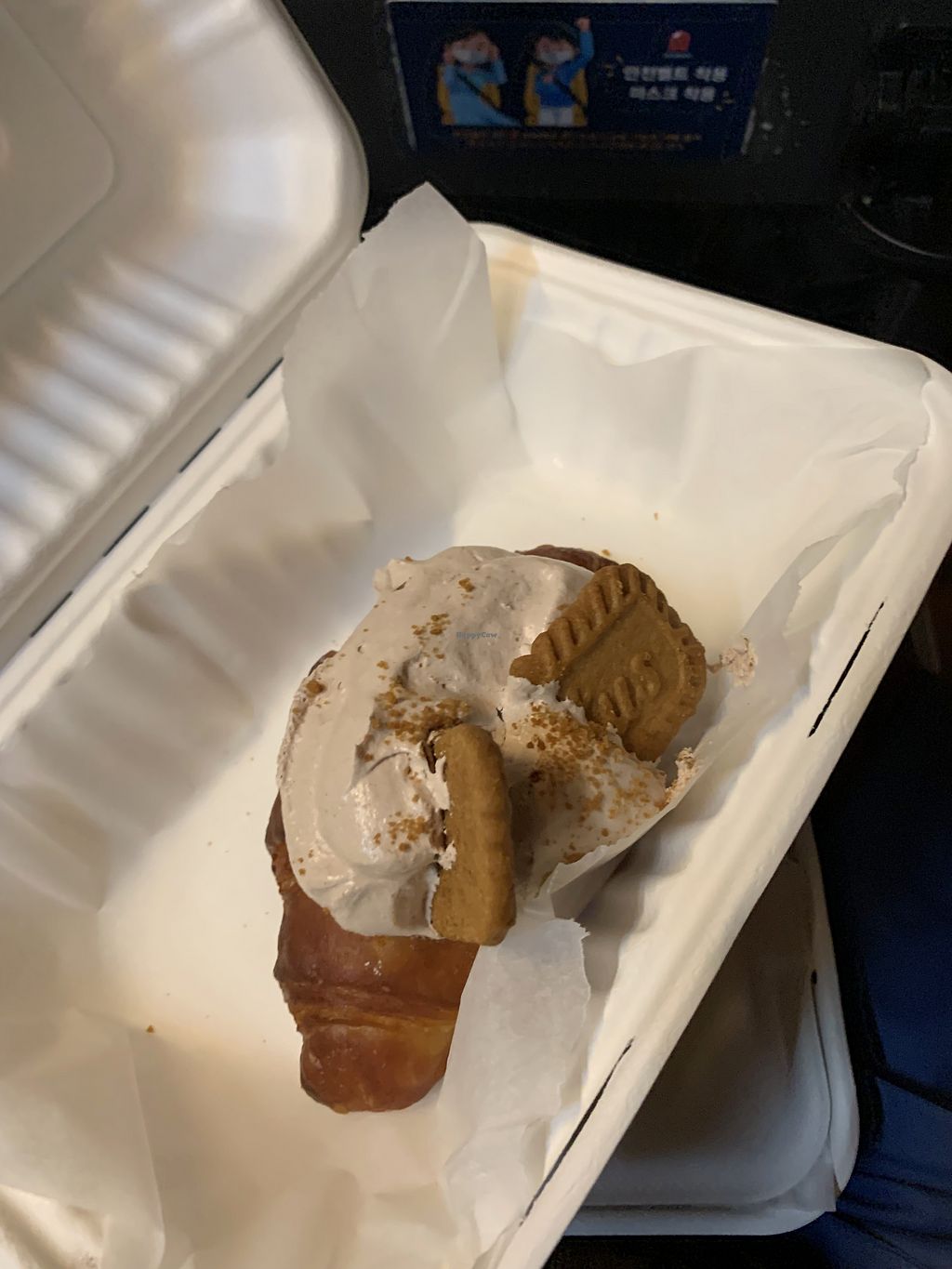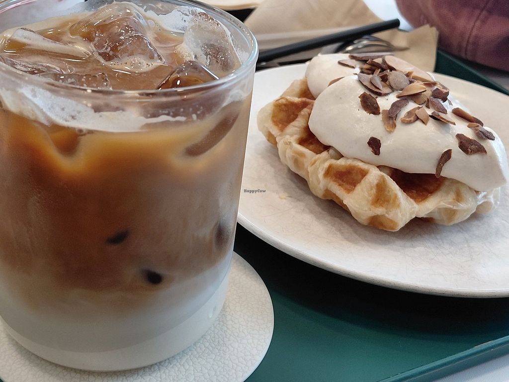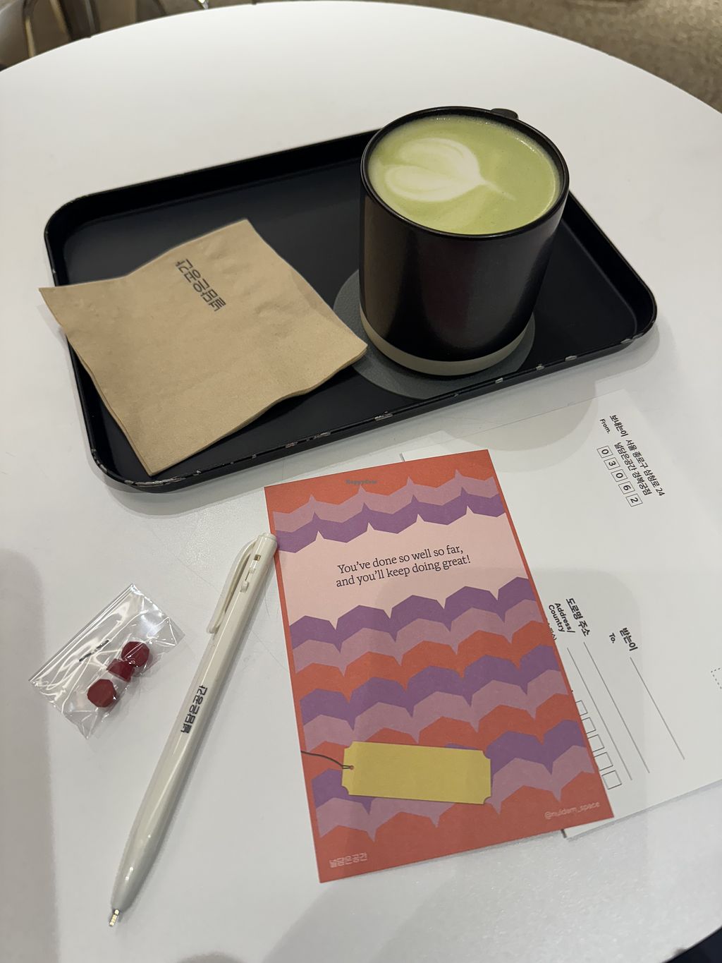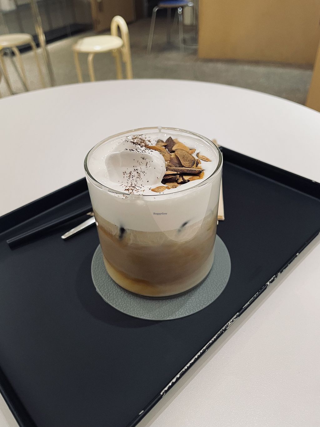 (clockwise from top left) Hot latte; matcha croissant, specialty almon…