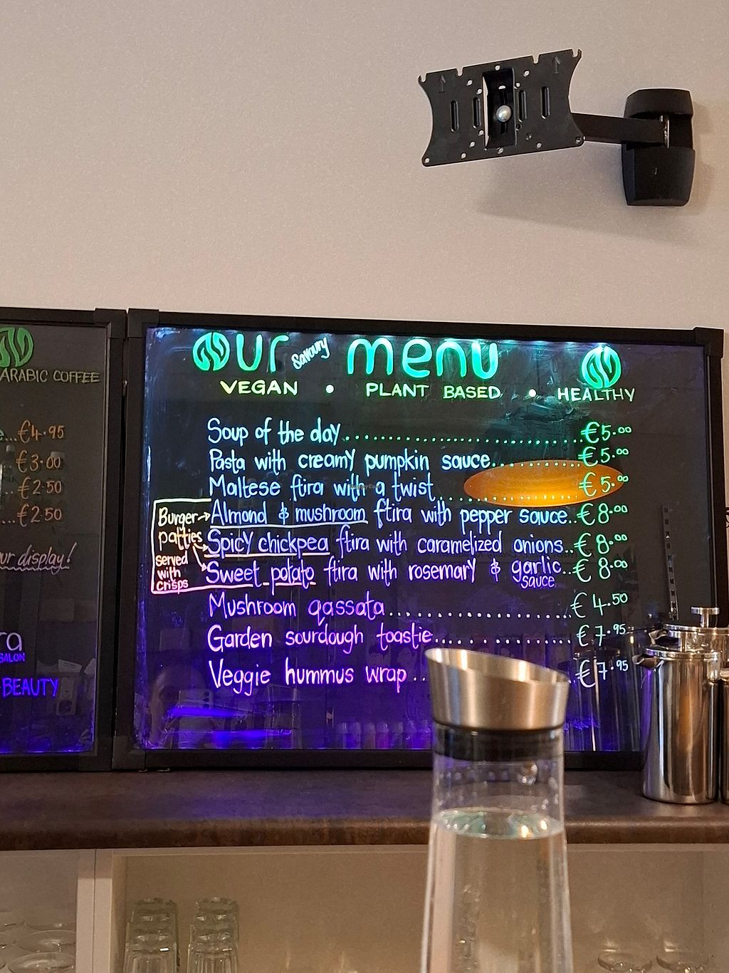 A lovely family run business with lots of hot and cold drink options (including freshly made plant milk!), several lunch options (good portions and very reasonably priced!) and a selection of cakes. We had a maltese ftira, creamy pumpkin pasta, banana & coconut cake, a coffee and a gooseberry pop. It was all really delicious and the staff are so friendly and welcoming. We’ve been back again and plan to go one last time before we leave tomorrow. Would highly recommend!