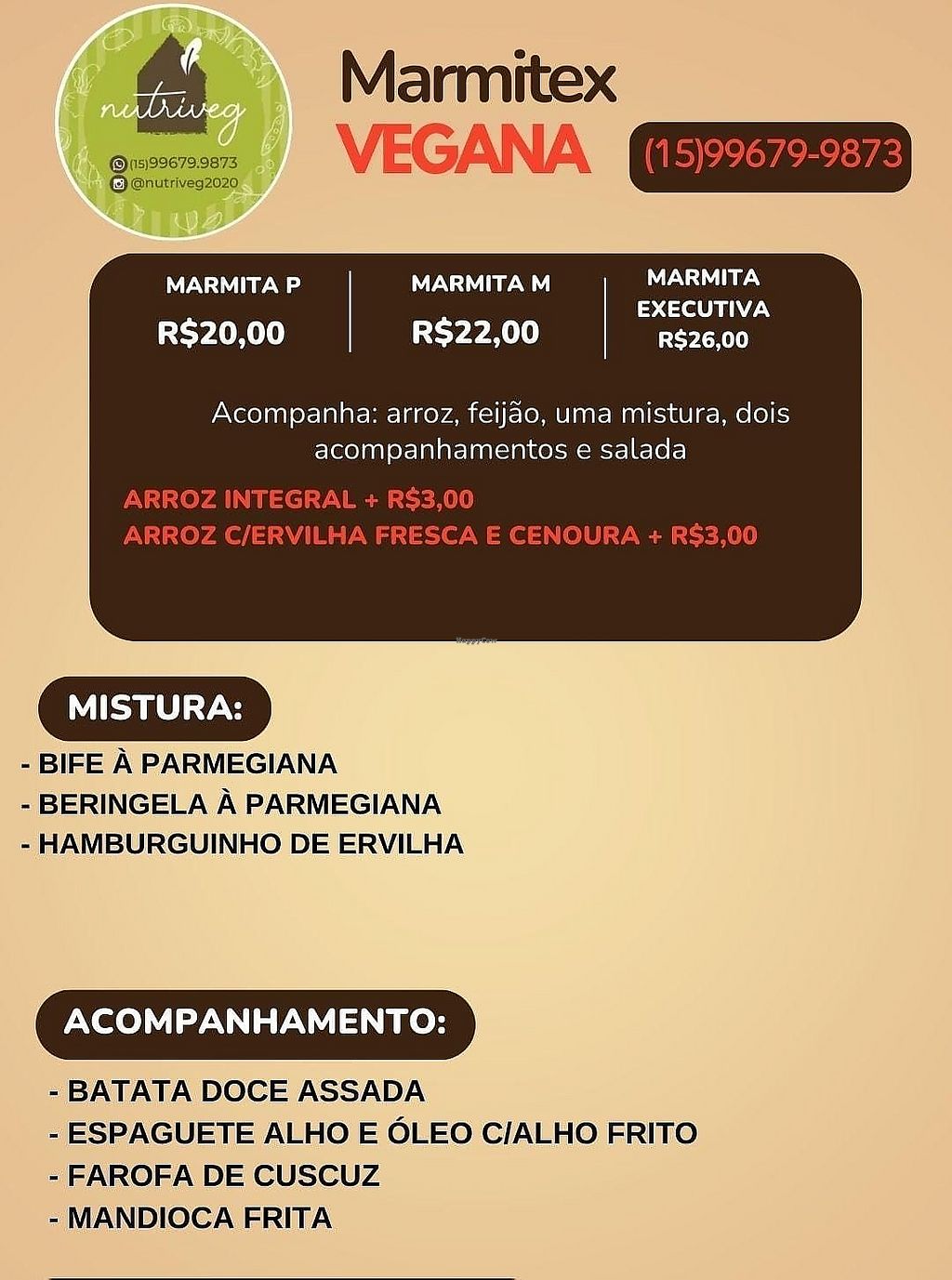 Pros: Parmegiana de bife vegan, Macarrão alho e óleo, Farofa crocante