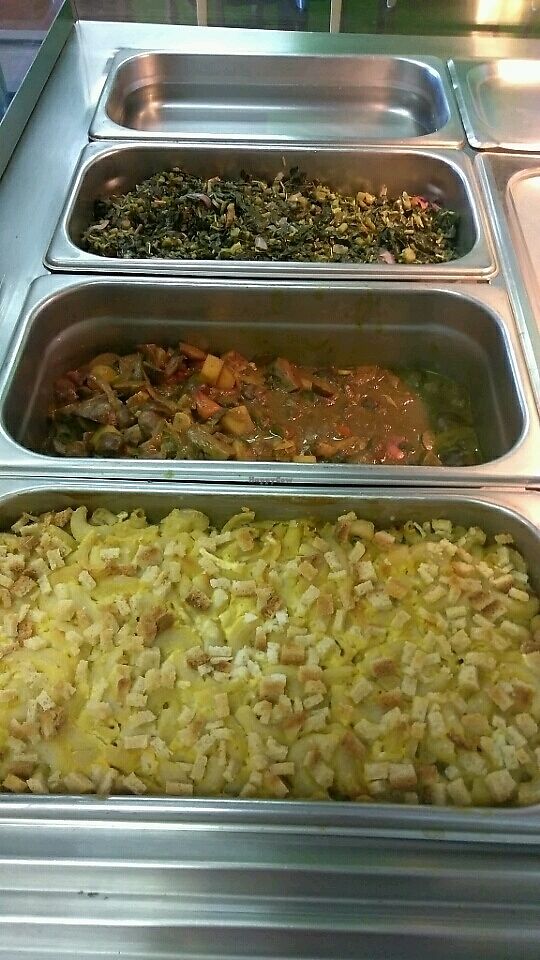 Hot food served daily different menus. Had the zugetti and not meat balls and spiced mushrooms, blueberry cheesecake. Pretty good. Be prepared to wait if arriving before noon.