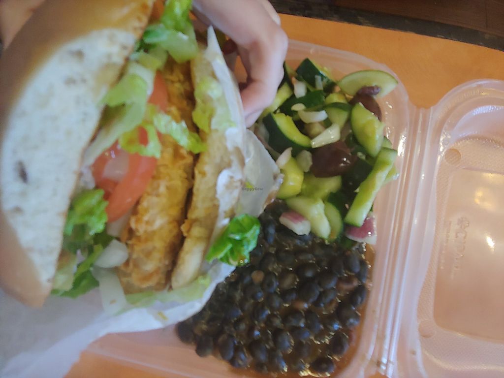Vegan Chickn Sandwich with Savory Beans and Greek Salad