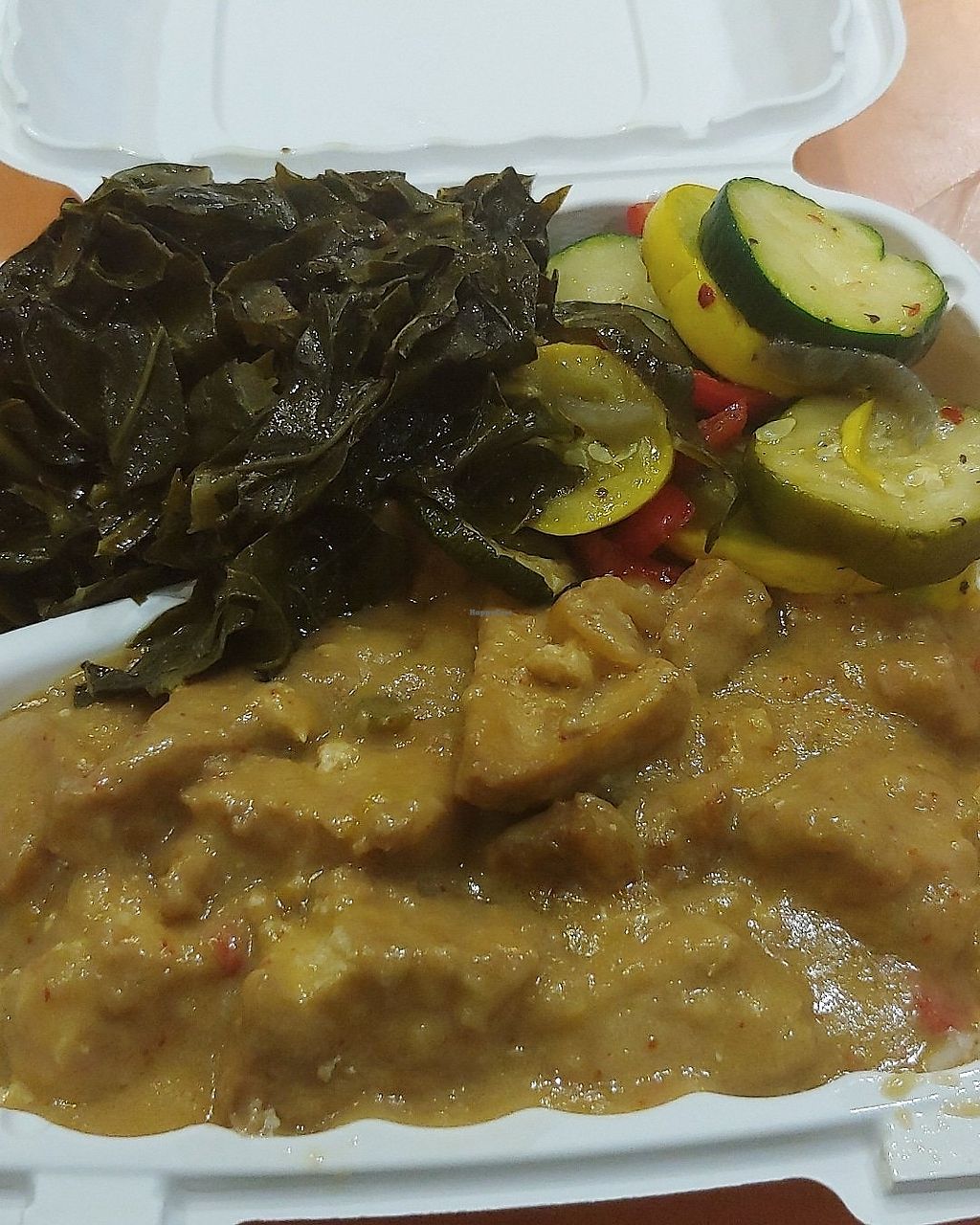 Ginger garlic tofu, collard greens, and zuchinni