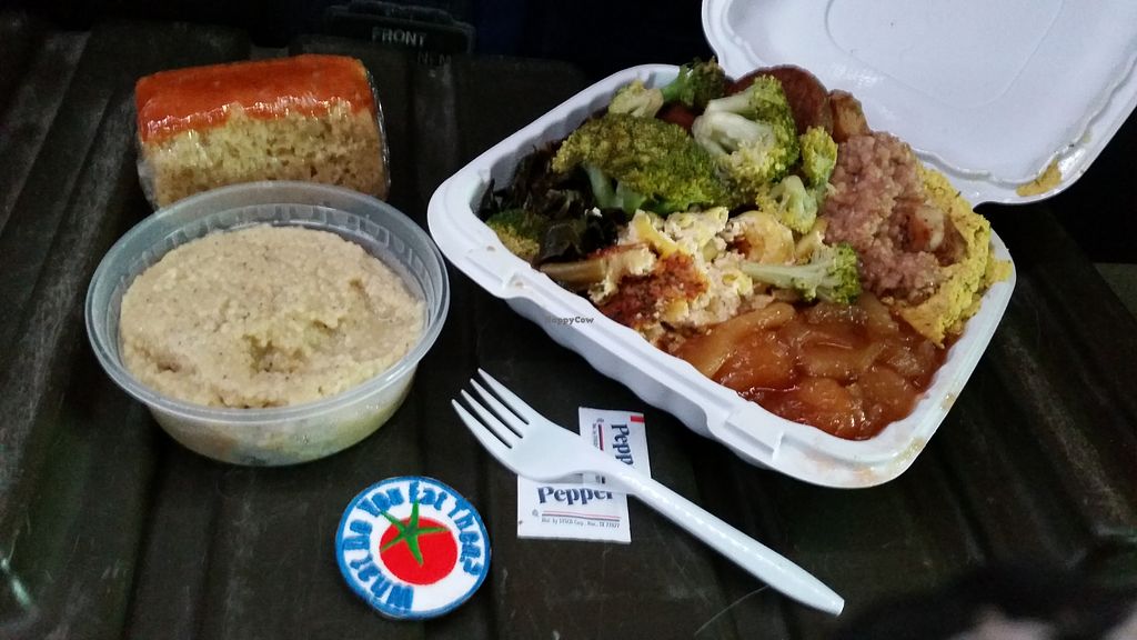 Okra & tomatoes, collards, sweet potatoes, and vegan mac