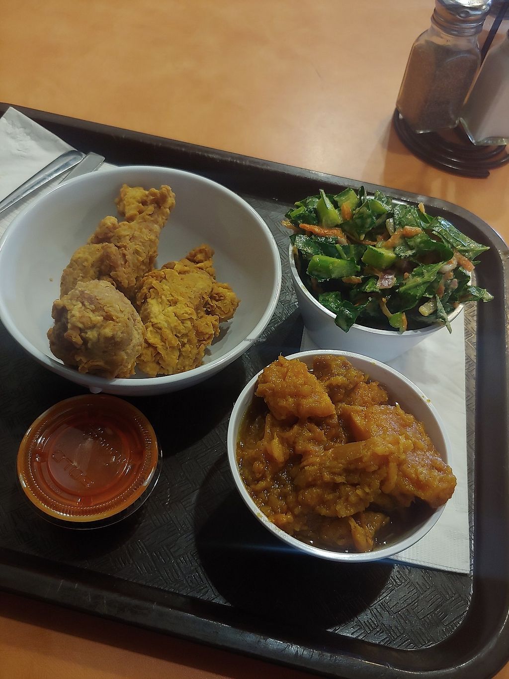Chickn Tenders, Bbq sauce, Collard greens and Greek salad