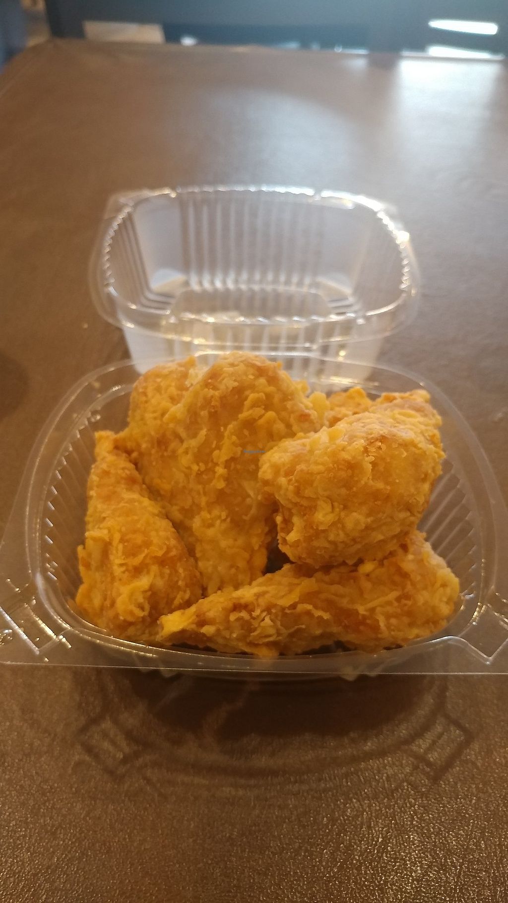 Chick’n drummies with side of hot sauce & BBQ sauce, mac n cheese, swe…