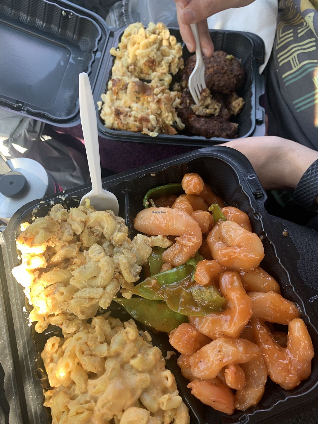 Vegan fried chick, BBQ tofu & rice, Mac n cheese & Yams