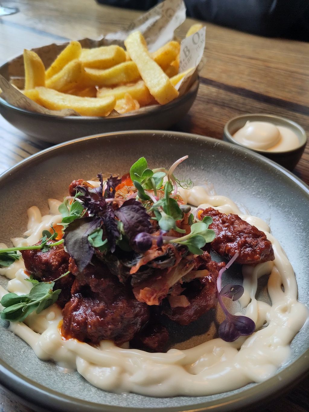 Vegan charcuterie, and basket of fried chicken