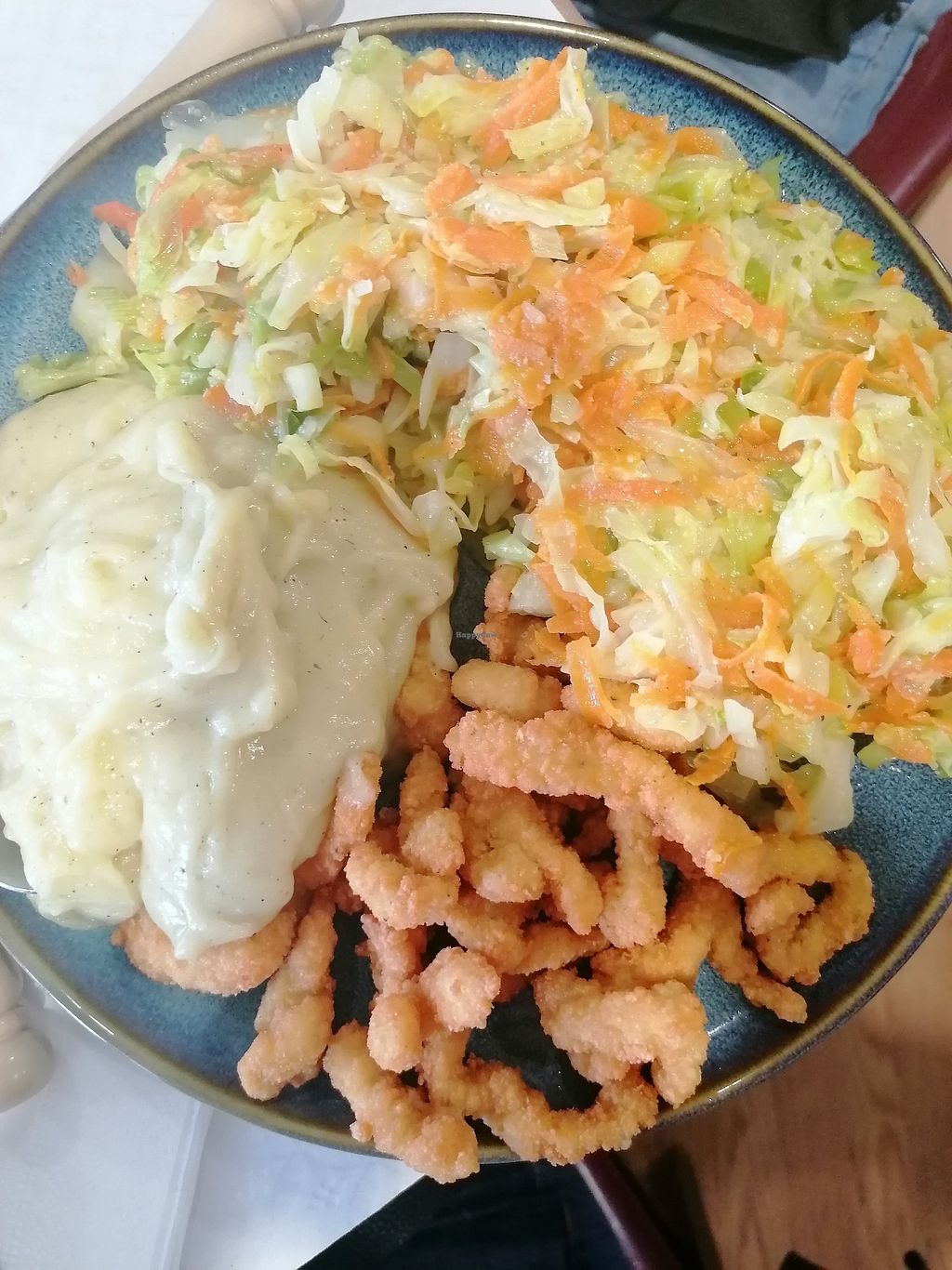 Opção vegan, disseram ok e trazem um prato com puré de batata, legumes salteados e tirinhas de frango panado. Questiono a funcionária, diz que é couve flor. Questiono novamente, vai ao congelador ler o rótulo do saco das tirinhas e confirma:sim, é frango.…! Alternativa? Nenhuma.