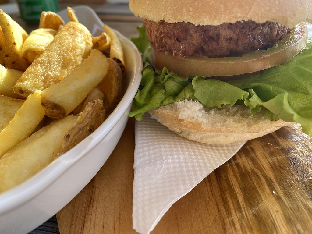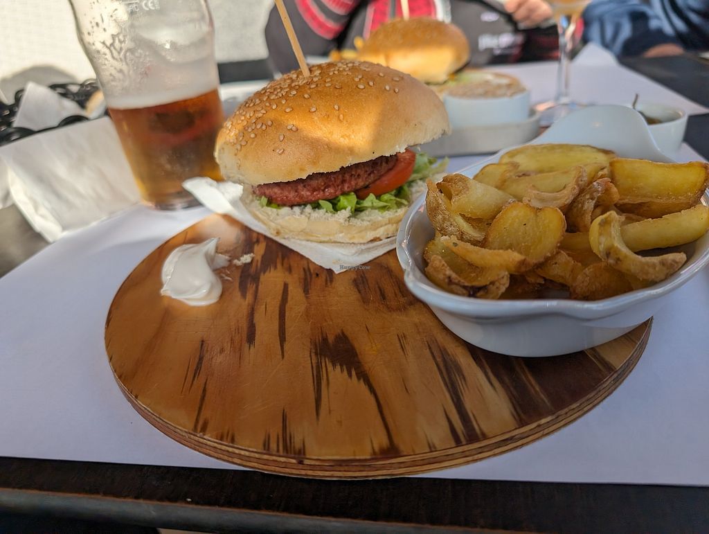 Vegan burger with fries and vegan mayo