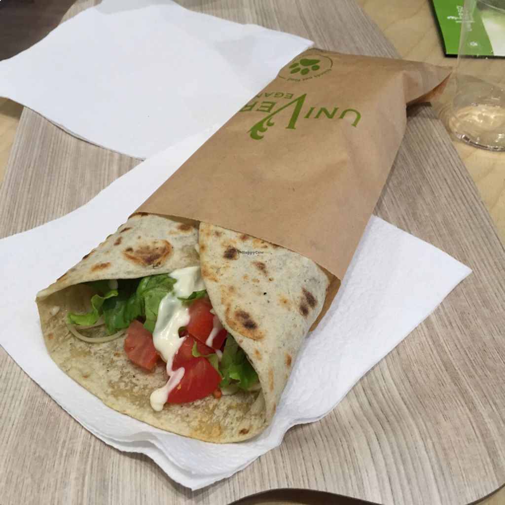 Universo Vegano in Parma is a nice small chain restaurant offering a large menu with ranging from pizzas to sandwiches, from salads to more refined dishes. The owner is super friendly and knowledgeable, and will welcome you with a smile. I was also offered a small free appetiser while waiting for my order. I had a hummus ball sprinkled with seeds, and then a large dish with salad, roasted potatoes, a very big portion of vegan kebab served with a homemade turmeric bun, and a selection of vegan mayo and spicy sauce. The portions are big and filling, but not at all heavy. Definitely recommended.
