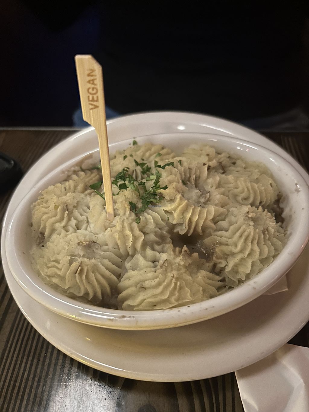 We had the vegan pot pie and the vegan bacon burger. The pot pie was a bit bland but my partner liked the burger. There are lots of options on this menu, including dessert which I wish we had tried!