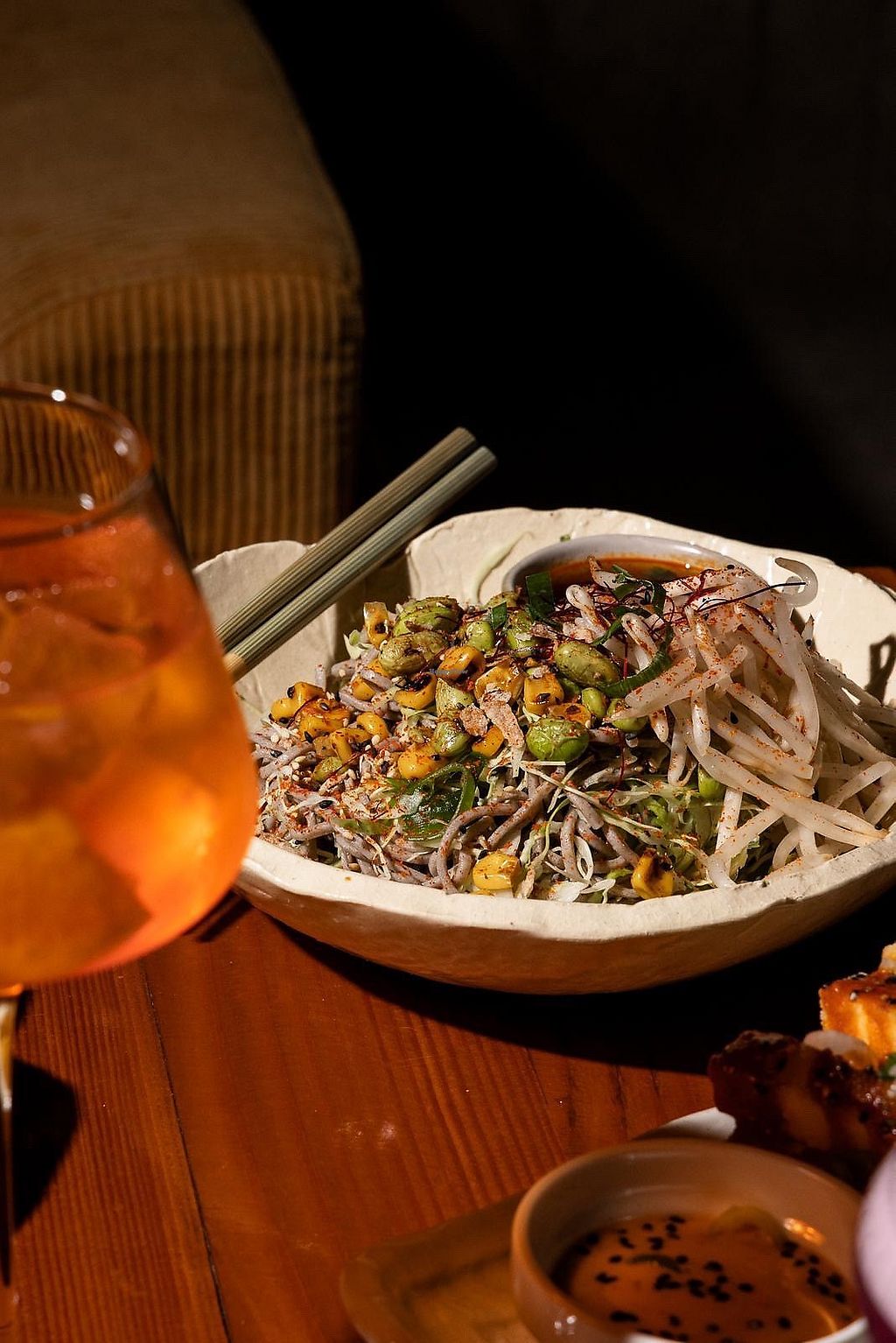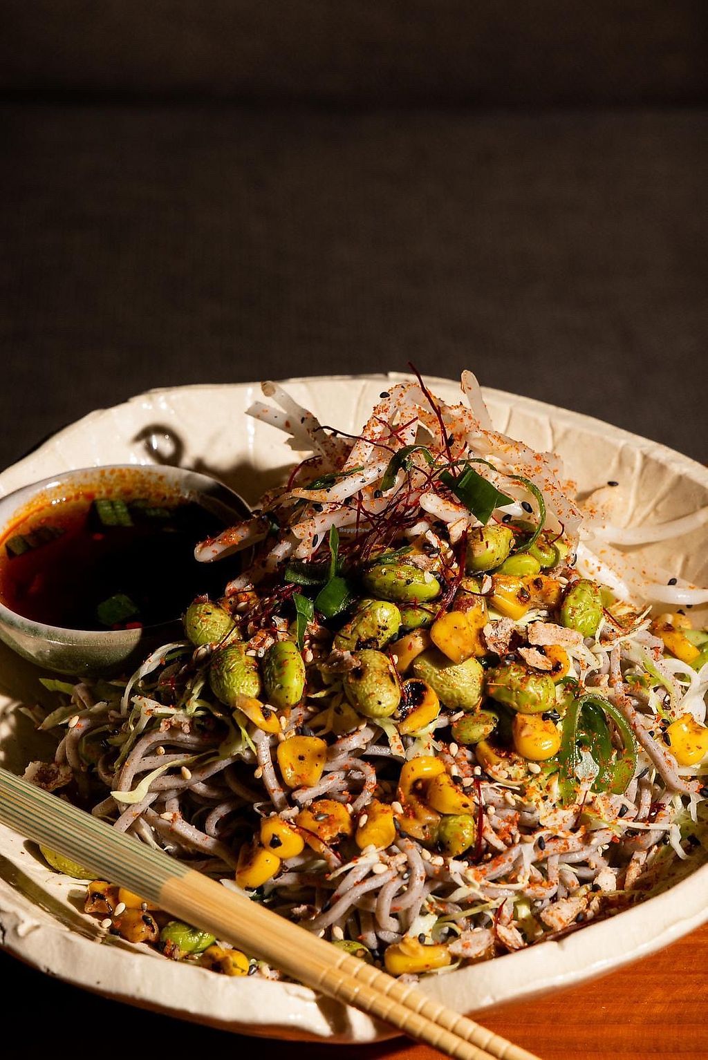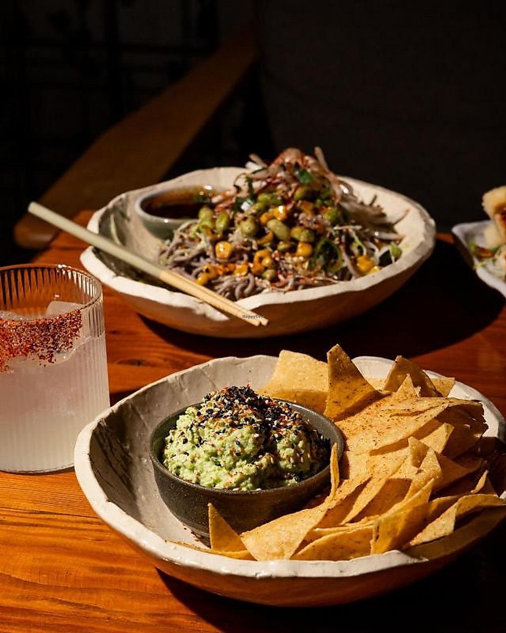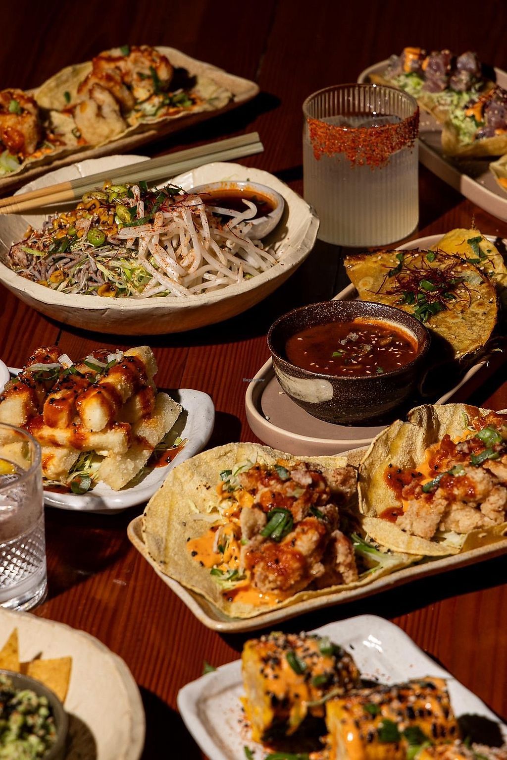 Serves meat, vegan options available. Japanese bar serving Japanese- and Mexican-fusion cuisine with many vegan menu options, such as tofu fries, avocado & edamame dip, soba noodles, miso mushroom tacos, cauliflower tacos (not on menu - ask), and cocktails. Has a vegan substitue for egg white in cocktails. Vegan cheese available. Specify vegan when ordering. Gluten-free choices available. Open Mon-Sun 4:00pm-12:00am.