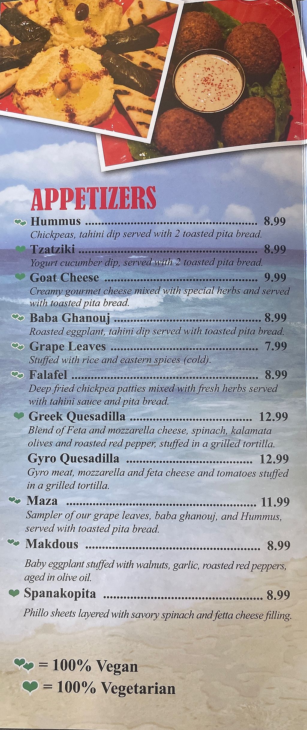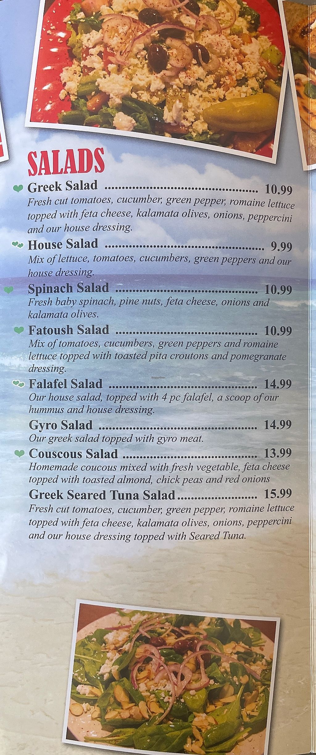 Plenty of Vegan options!! I ordered a house salad and side of grape leaves and was very pleased😄the staff was super friendly and service was very fast. Will be returning :-)