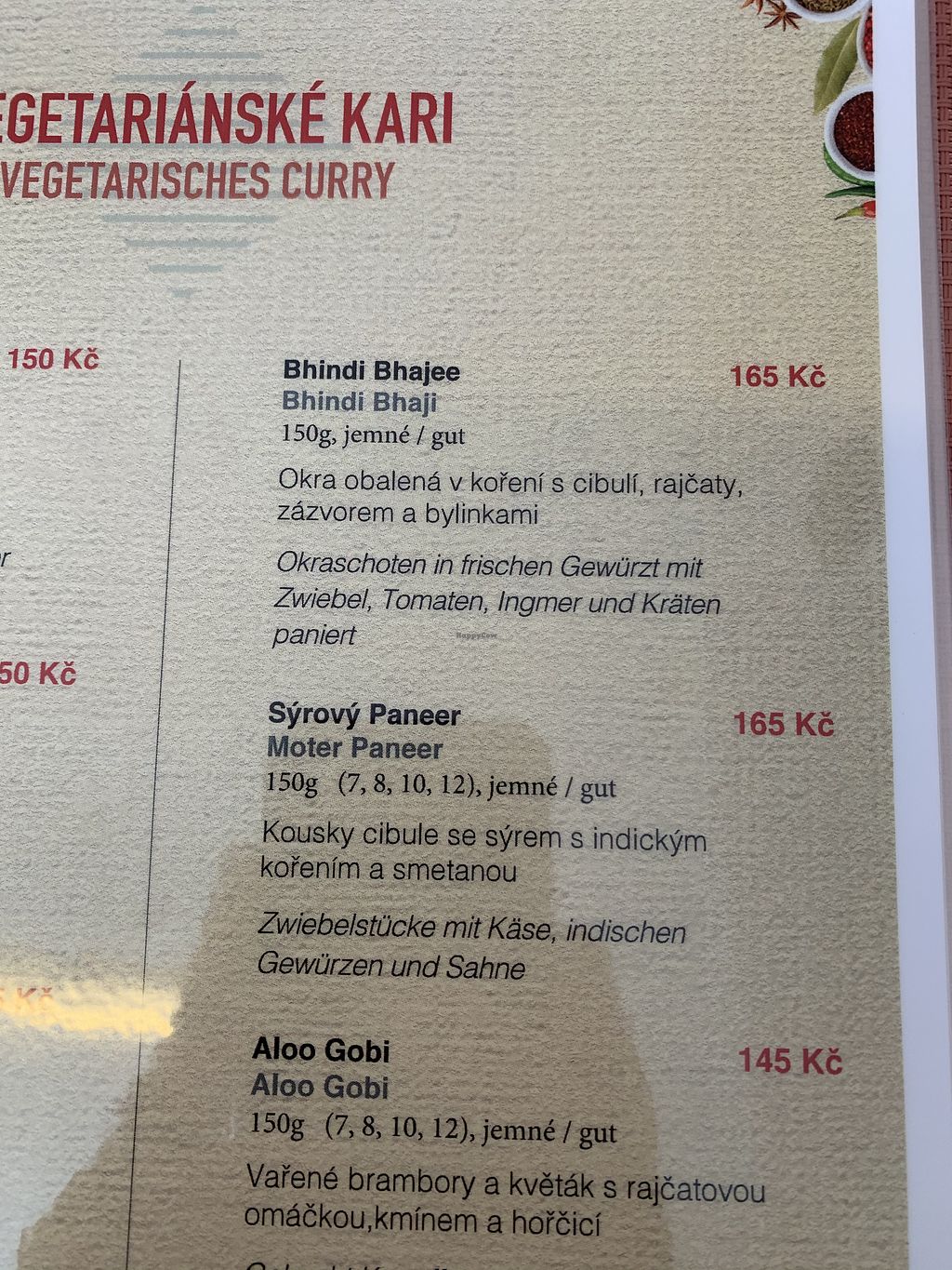 Read moreI ordered Bhindi Bhajee (see the picture) with plain rice and it was quite good. (It costed approximately 210 Kč). They also offer some salad with chickpeas and soups.