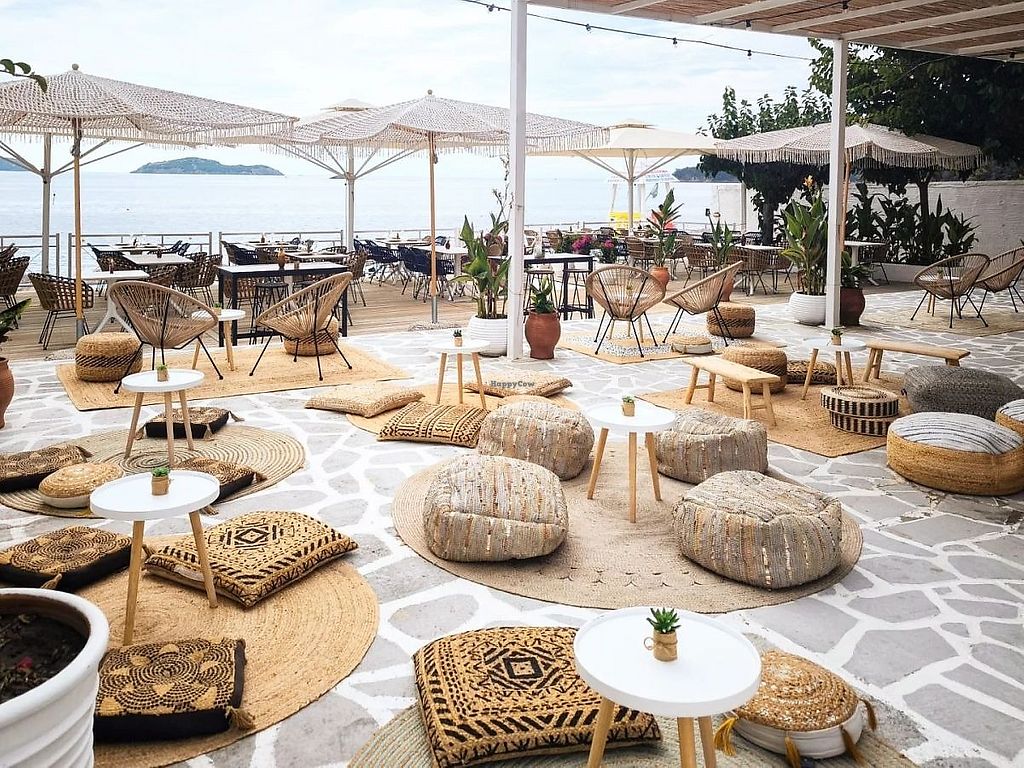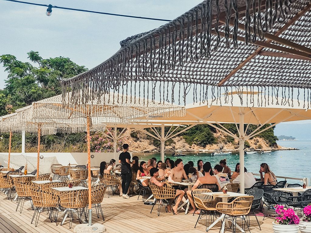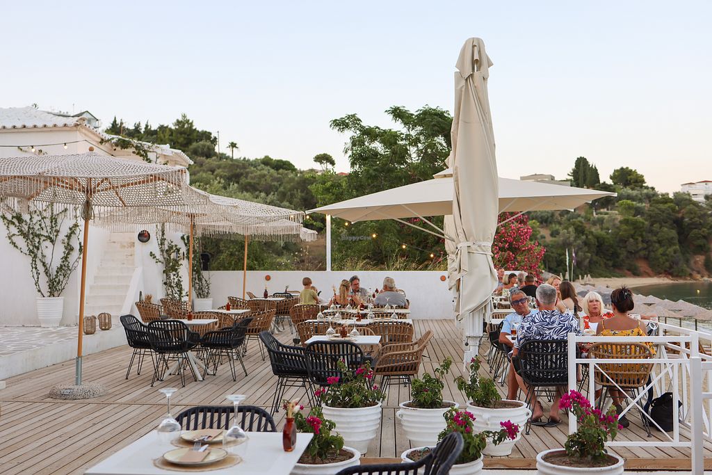 Seafront view of Achladies Beach at the octopus beach bar and restaura…