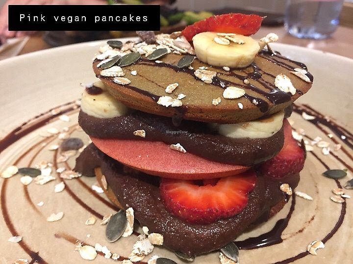 Lush, open, cool and calm environment. Good options for vegans!! I opted for the pancake stack. Beautiful presentation of rainbow pancakes with generous lashings of chocolate spread which was delicious, wholesome and homemade. Lots of strawberry’s and bananas and a sprinkle of sunflower seeds and oats for decor.