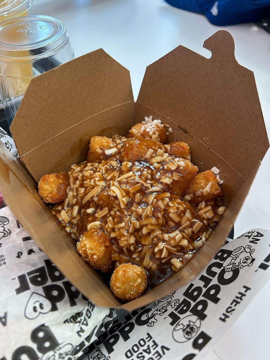 Love that this place is vegan, prioritizes sustainability in their packaging, and makes all their proteins in-house. However, the food itself isn’t so good that we are making a point to return on this trip…know what I mean? The flavors just don’t pop. The onion rings feature red onion, which I think is notable (and delicious!). I would say the burgers are better than the chicken sandwiches and the poutine can be skipped. It’s not “bad”, but I just think your $10 is better spent on other menu items.