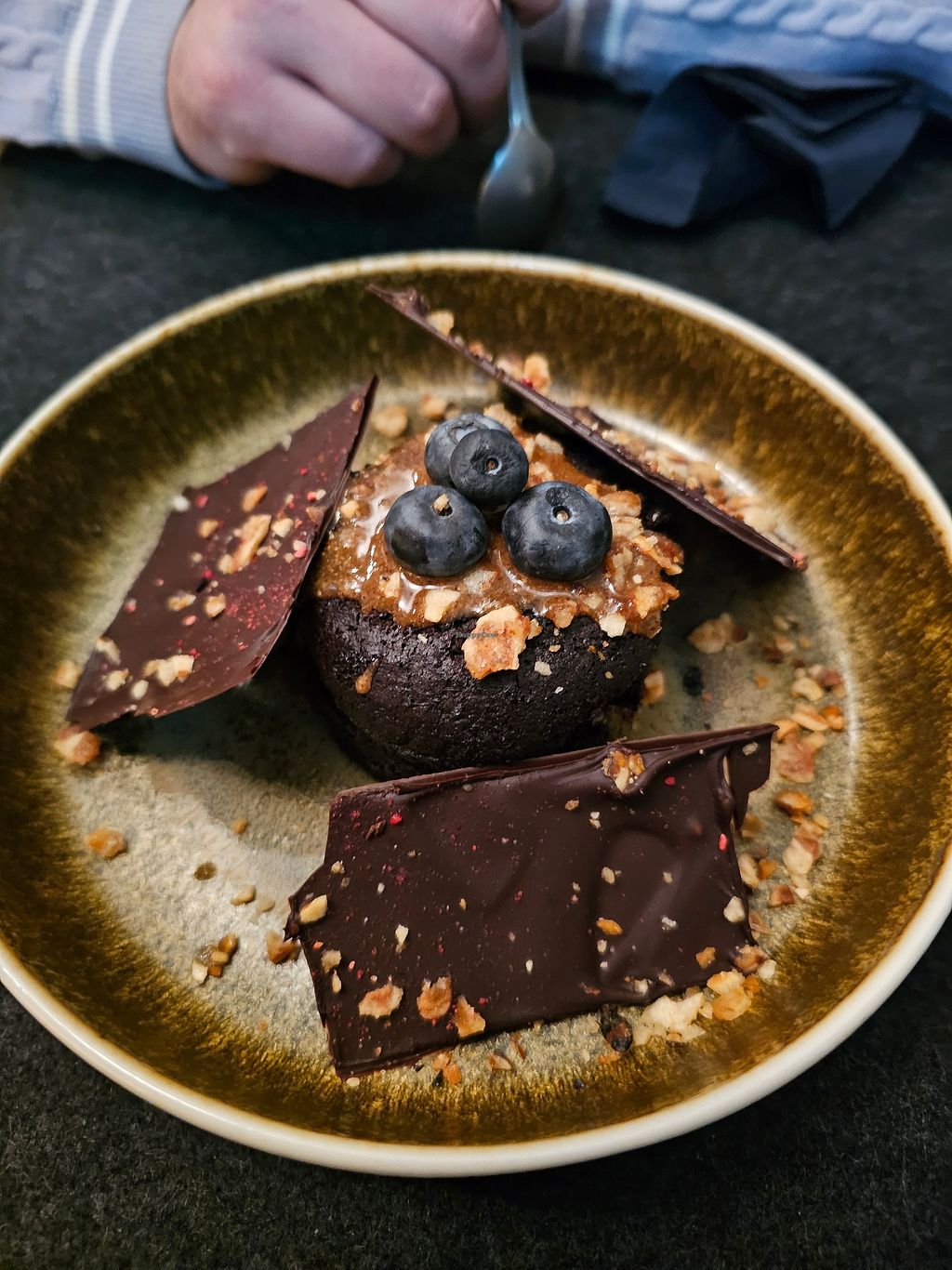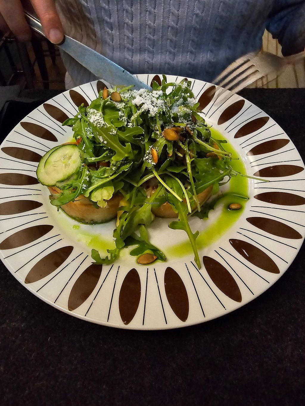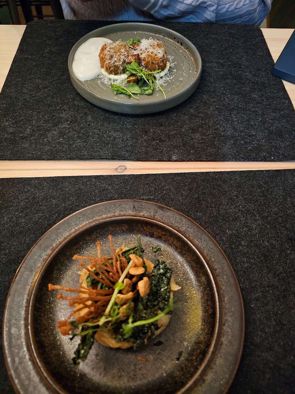 Potato dumplings, lingon berries, tempeh, root vegetables, rocket