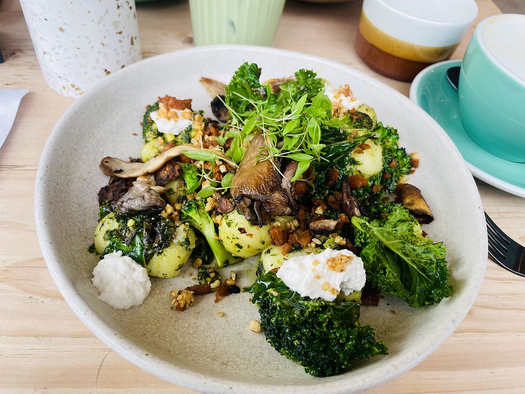 Pesto gnocchi- with broccoli kale and mushrooms- my favourite dish
