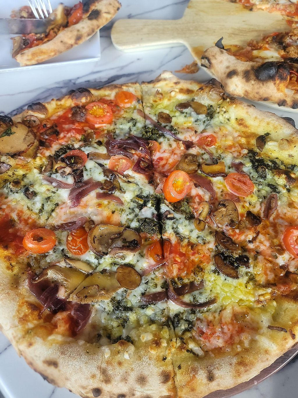 Gabriele: vegan cheese, spinach, cherry tomatoes, mushrooms