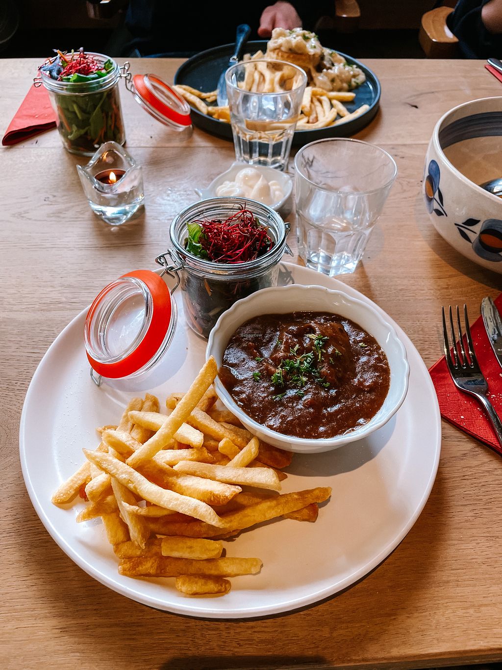 Stoverij met frietjes is heerlijk. Grote porties. Ook desserts zijn lekker