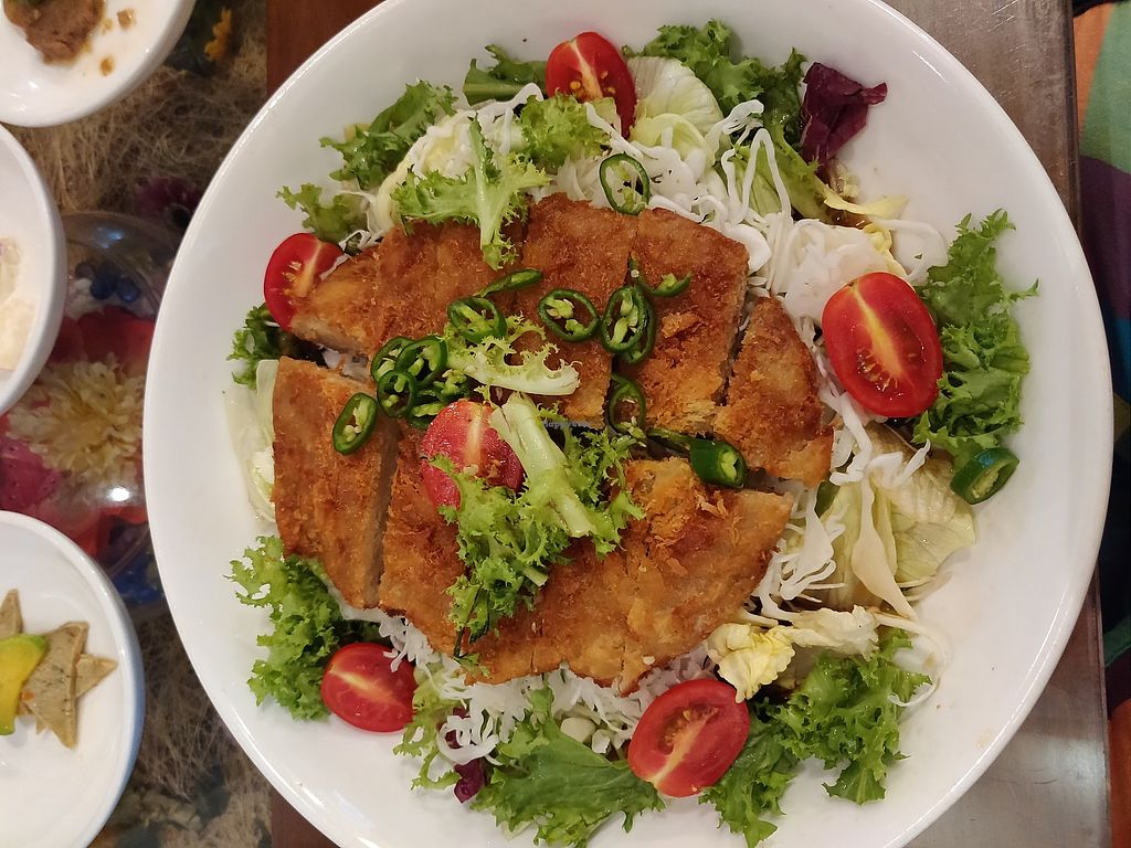 Vegan chicken, dumplings (4 pcs.), Stew and all the sights that came w…