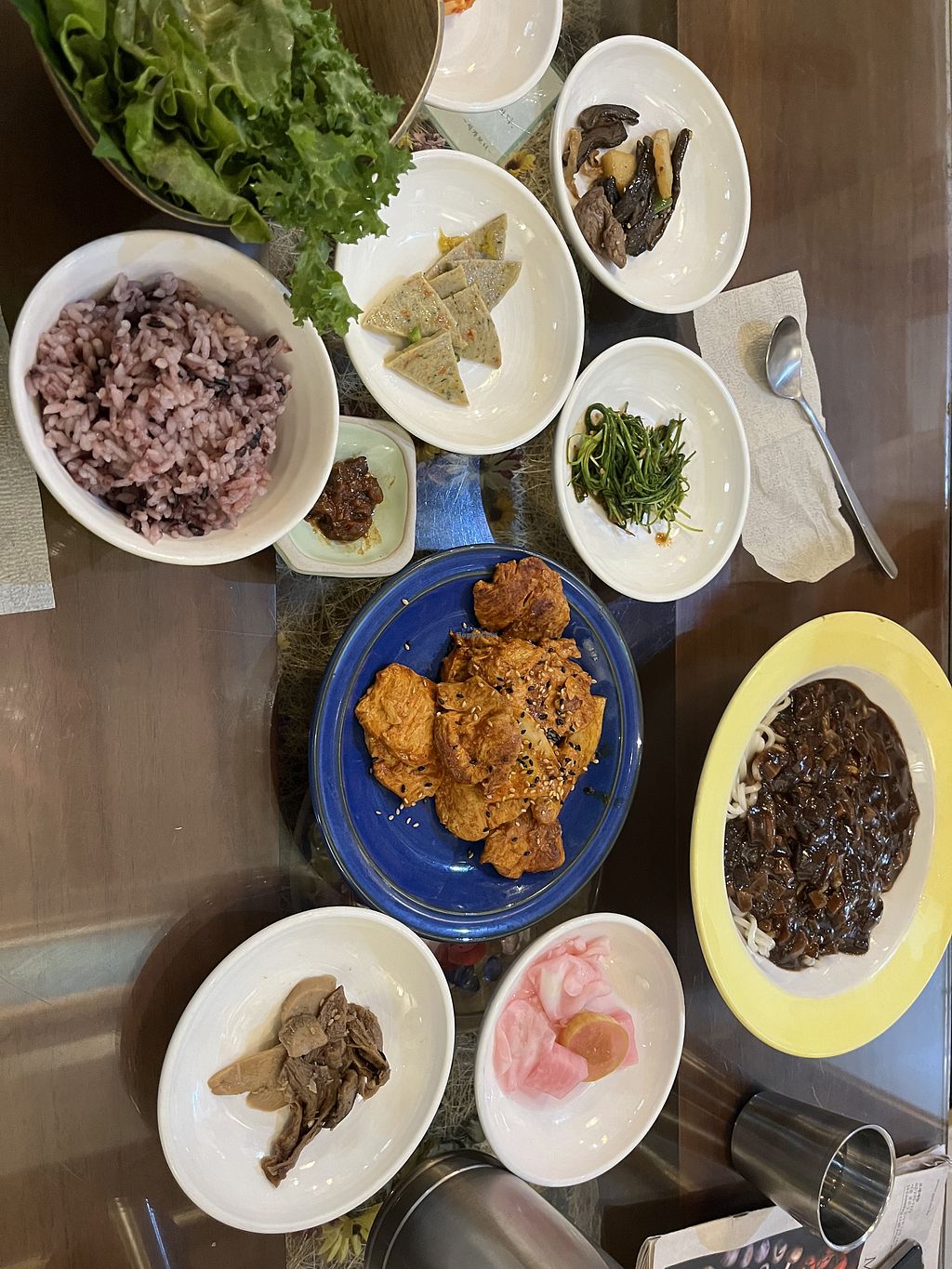 Bulgogi with rice, jajangmyeon and fried chicken (not spicy)
