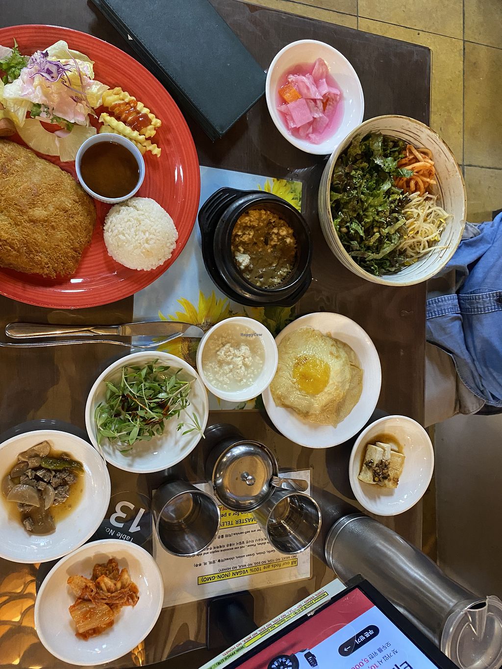 곤드레비빔밥 (Cirsium Setidens BiBimBap) Set, 비건끼스 (Vegan Cutlet) and 비건겨란후…