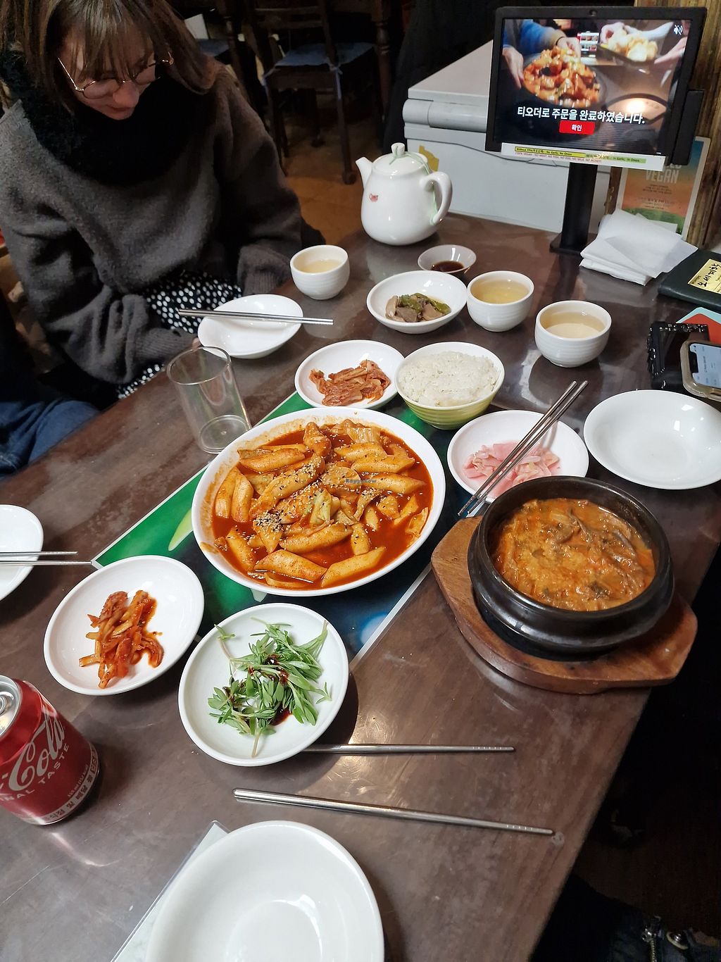 Bibimbap, spicy tofu stew, variety of banchan, and sweet and spicy fri…