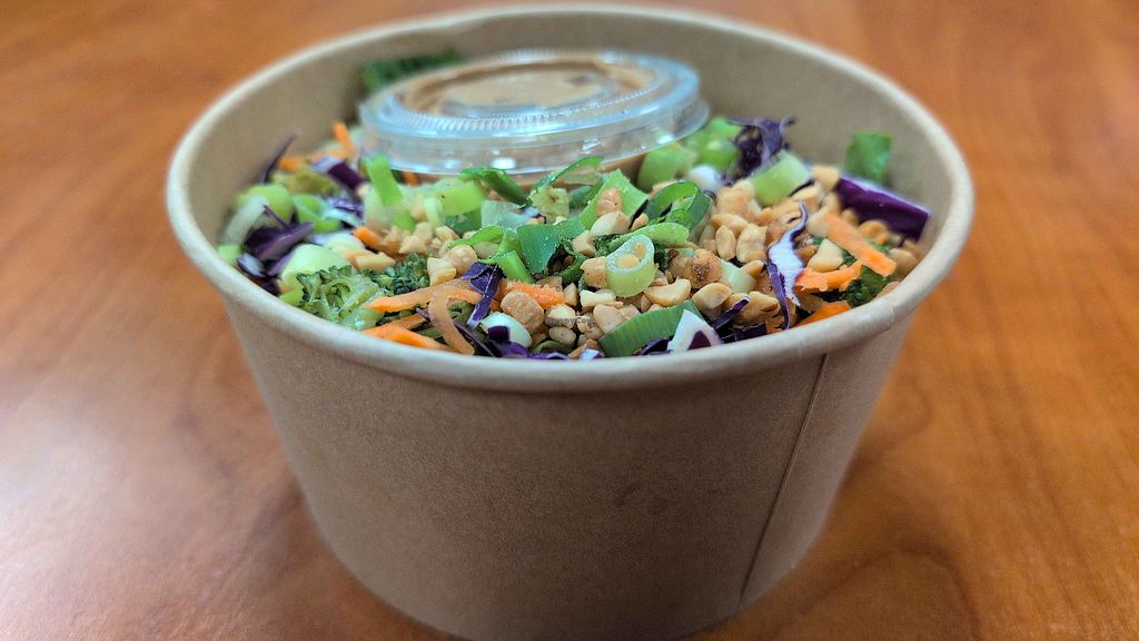 Serves meat, vegan options available. Motto is "fresh food fast." Menu offers a variety of juices and frozen smoothies, and smoothie bowls as well as toast with banana or guacamole, lunch bowls and wraps several of which are vegan as-is, with others possibly may be when you ask. Open Mon-Fri 8:00am-4:00pm. Closed Sun-Mon.