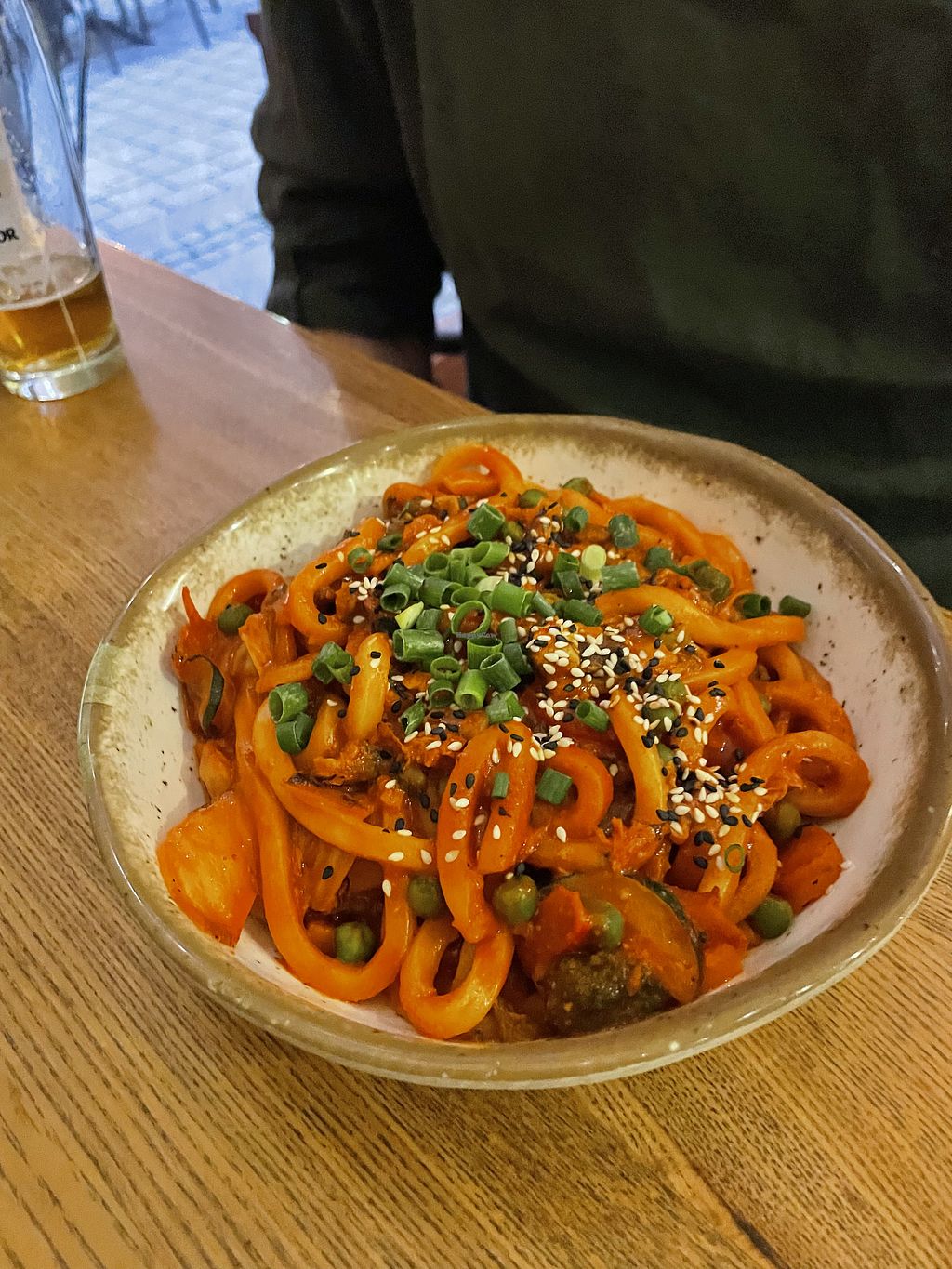 There are several vegan options (clearly labelled) on the Asian part of the menu (none on the pizza part) and what we had was good: wasabi coleslaw, kimchi (quite salty but very tasty) and udon noodles with gochujang sauce (spicy) and tom yum sauce (medium spicy).